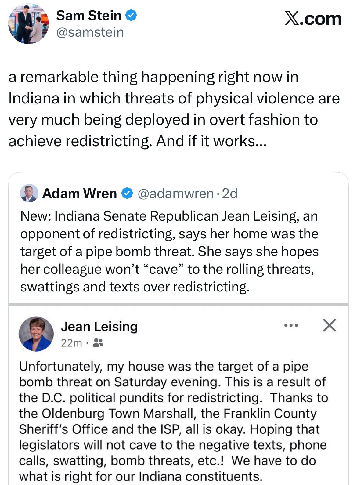 This is a critical battle, far beyond the two seats they are trying to steal. We must show that violence and threats of violence do NOT get you your way in American politics. And a Trump defeat in Indiana (a state controlled by Republicans) would be a huge symbolic victory for the bipartisan coalition standing up for democracy everywhere.