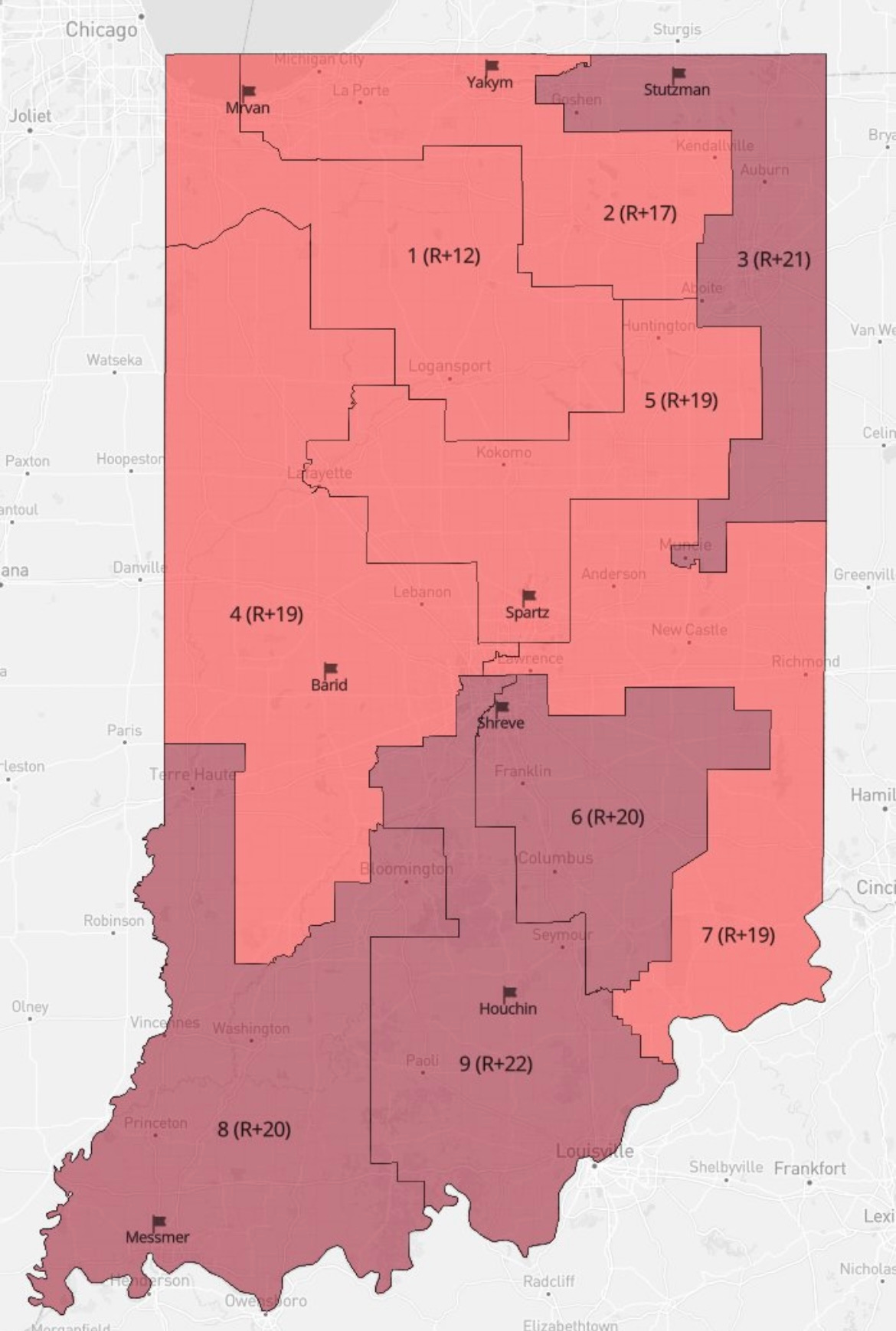 The map below makes it far more clear what they’re doing—eliminating the two remaining Democratic districts by splitting up urban communities, including splitting Indianapolis into four (!) different districts. Classic voter suppression, out of the Jim Crow era.