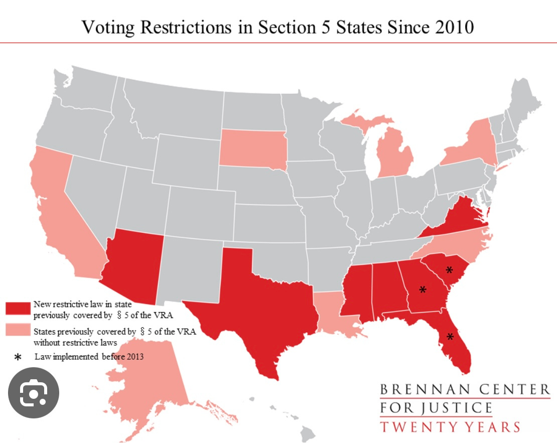 Section 5: this Section required states with a history of discrimination to seek pre-approval of any changes they wished to make to voting procedures. By proactively stopping thousands of potentially suppressive laws from taking effect, over decades, voting in those “covered” states was revolutionized. Long suppressed voters of color finally gained representation they had been denied for almost our entire history.