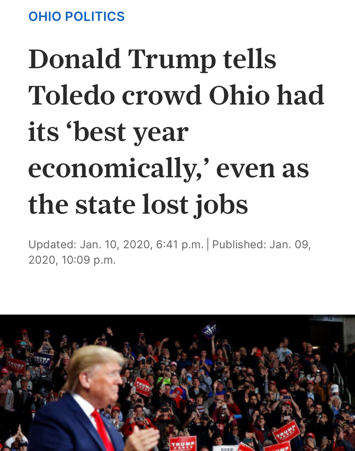 In Ohio, I know this…because I explained it all at a press conference in Toledo in January 2020. I was there to prebut a Trump rally where he touted that the Ohio economy was the “best ever” (like he said last night), when the truth was, 2019 had been Ohio’s worst jobs year since the Great Recession.