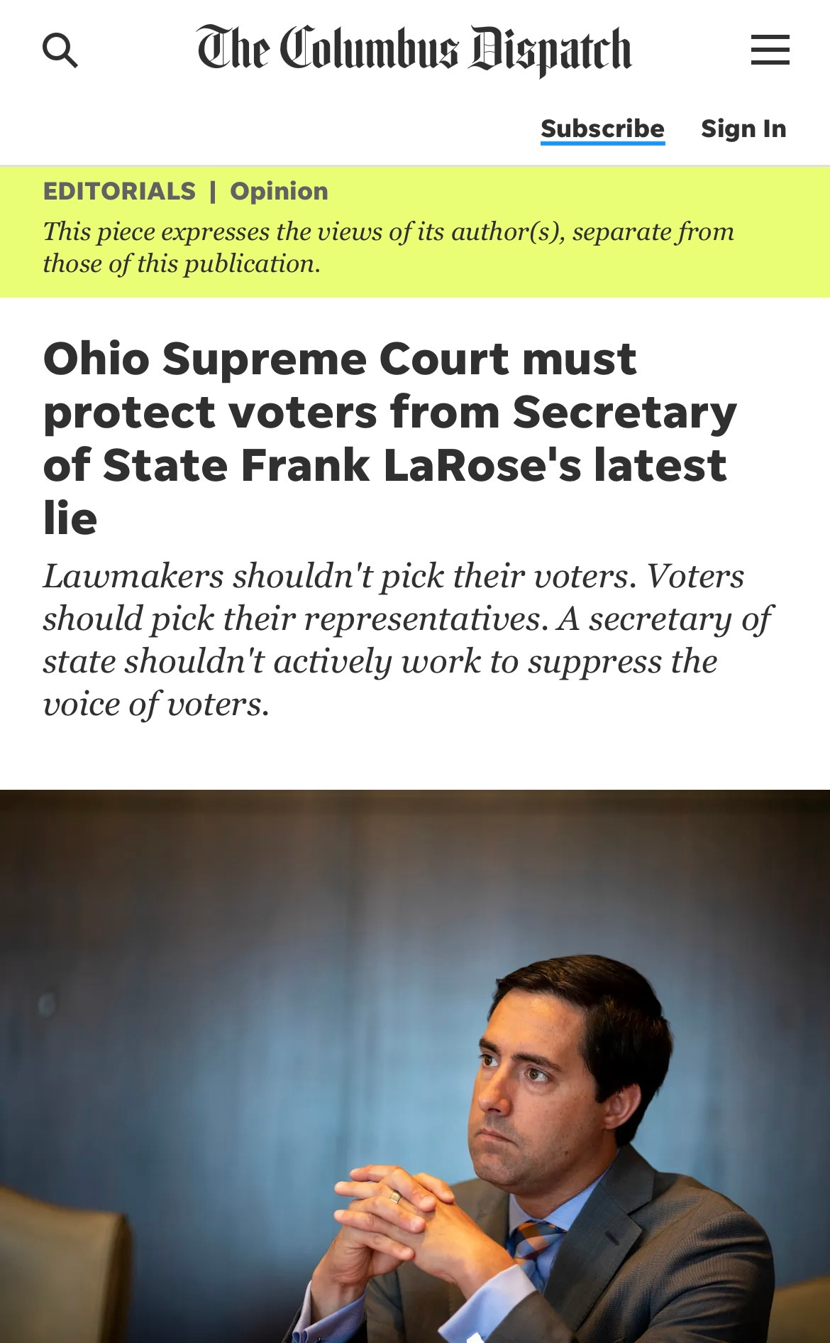 My additional response: it was Frank LaRose, Mike DeWine and legislators who are the ones that violated the “protections against gerrymandering approved by nearly three- quarters of Ohio electors participating in the statewide elections of 2015 and 2018”—7 different times! Their violation of those new amendments are the reason this new amendment is needed in the first place.