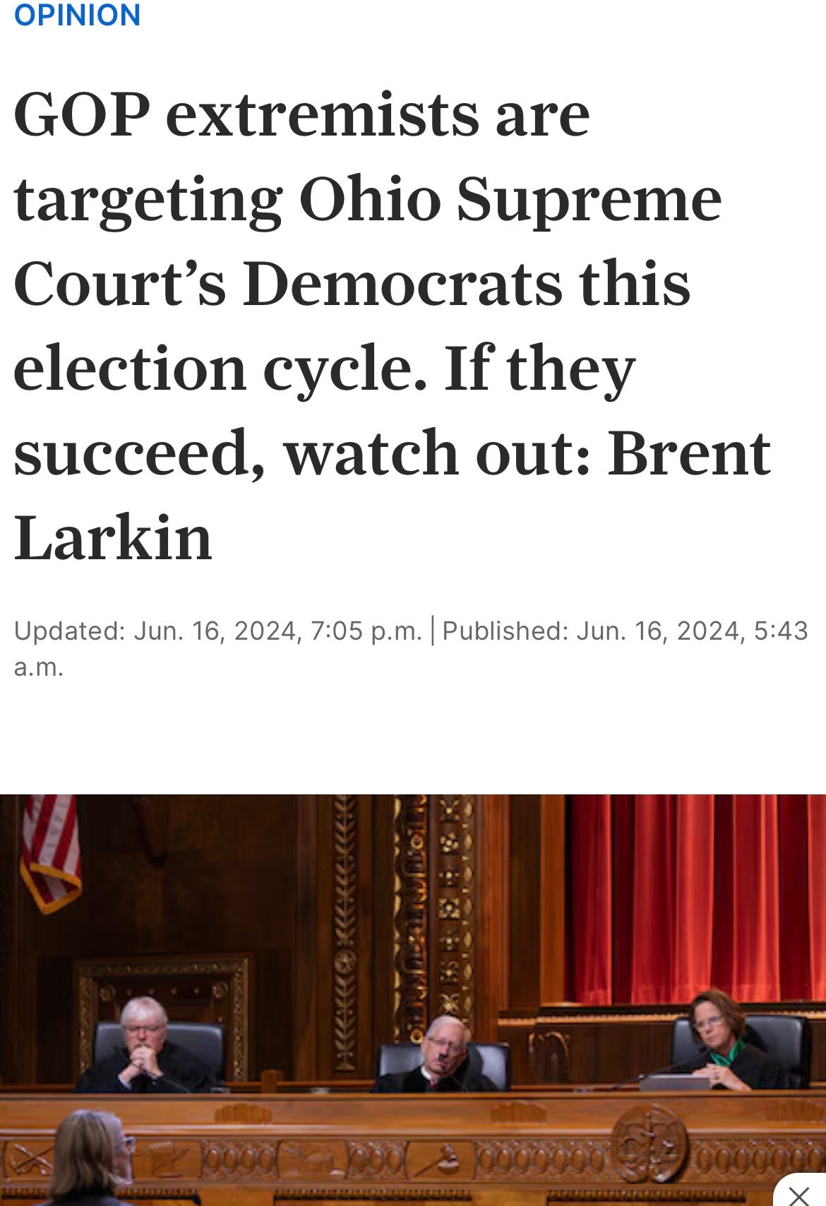 “Donald Trump twice won Ohio by eight percentage points, outcomes that speak volumes about the state’s voters. Another lopsided Trump win on Nov. 5 might just result in an Ohio Supreme Court that’s an even bigger threat to the state’s future than its loathsome legislature.”