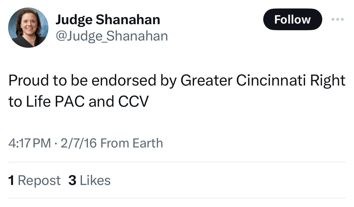 And the candidate challenging Justice Donnelly proudly touts the endorsement of the same group (Cincinnati Right to Life) that asked those survey questions above.
