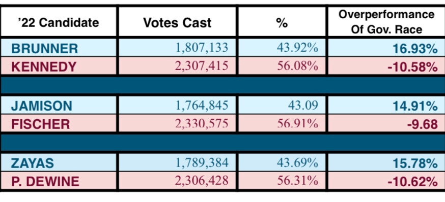 Which means that even with the terrible turnout of ‘22, and the fact that they were outspent and attacked, these three candidates lost by 12 to 14 points less than the top of the ticket.