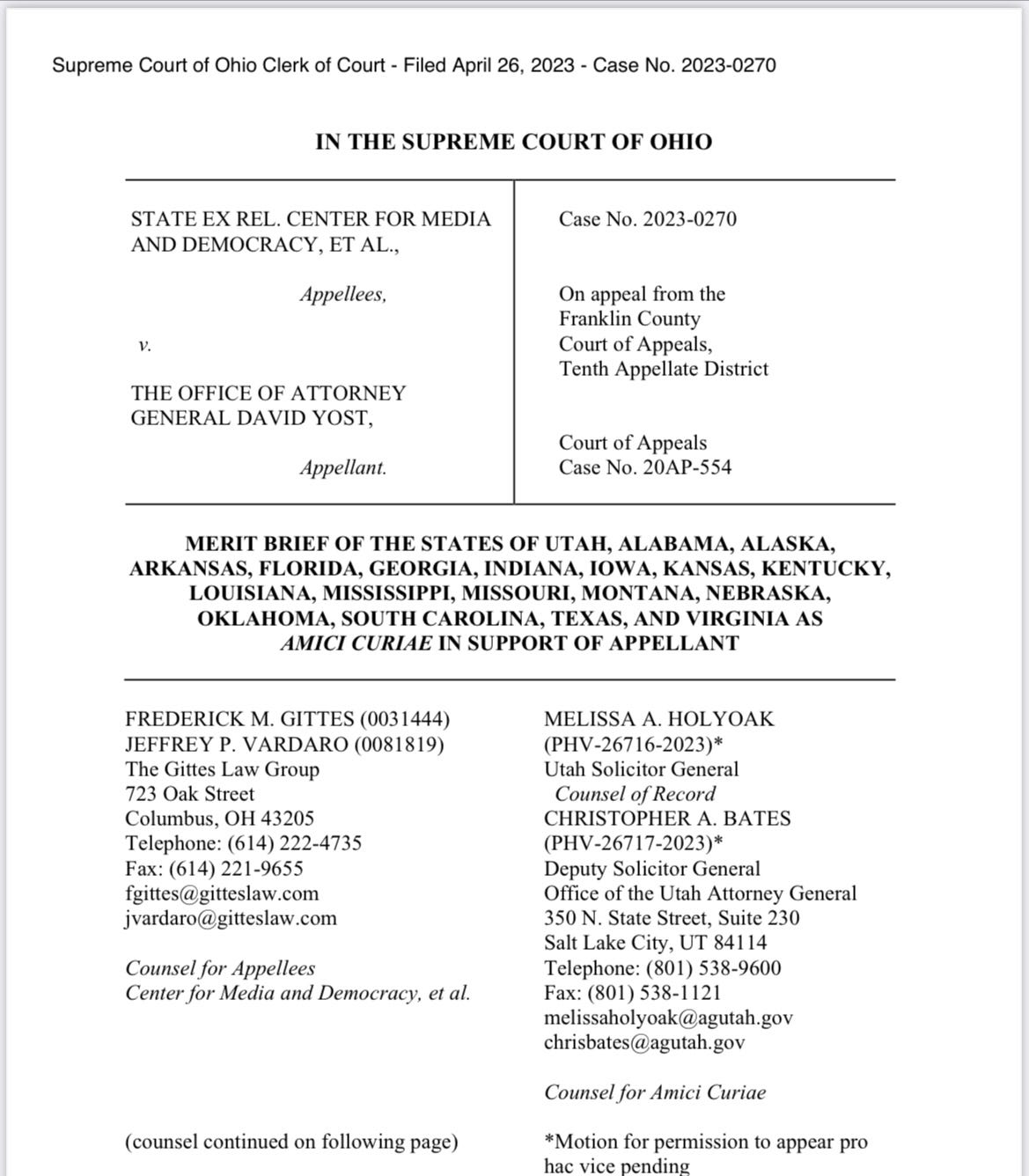 Interestingly, Yost isn’t the only one fighting the turning over of these documents. In a sign of how important the secrecy is to them, Yost’s RAGA buddies from around the country have filed a Brief in Ohio, taking his side.