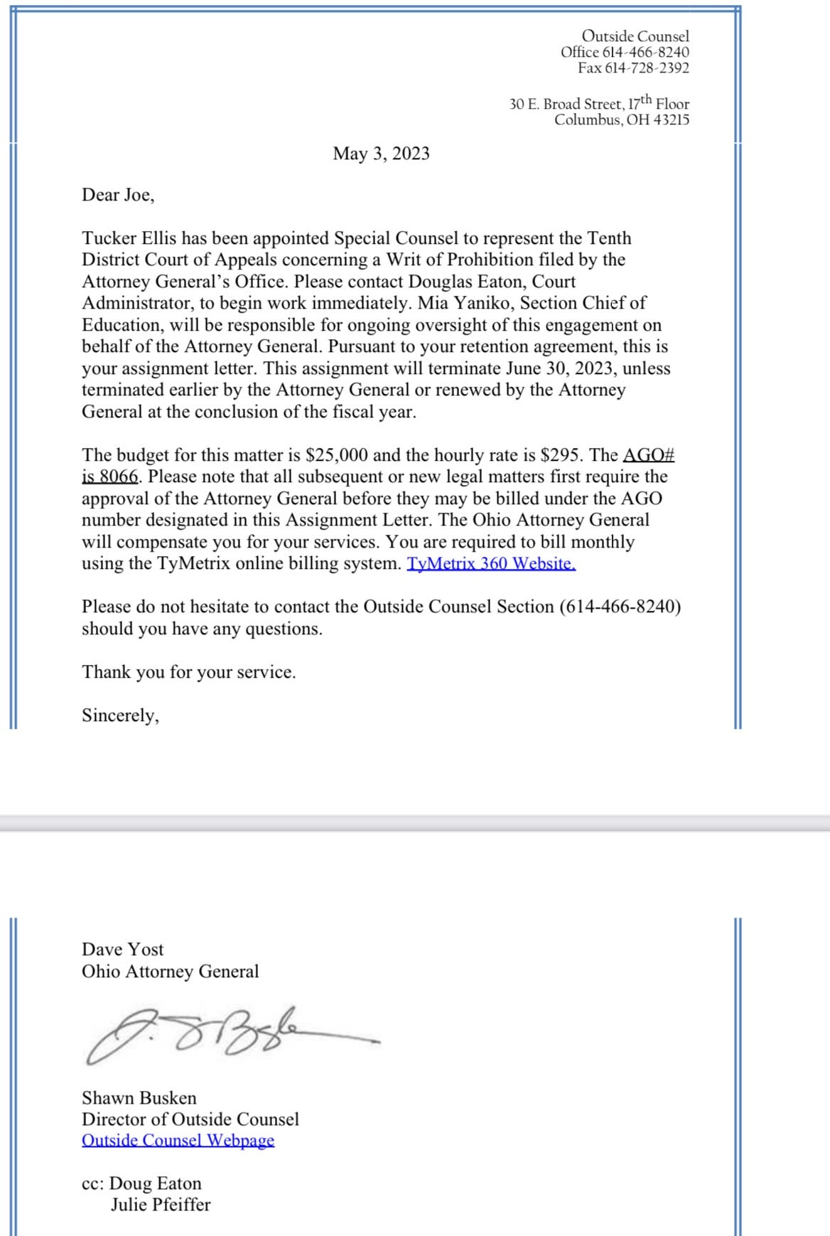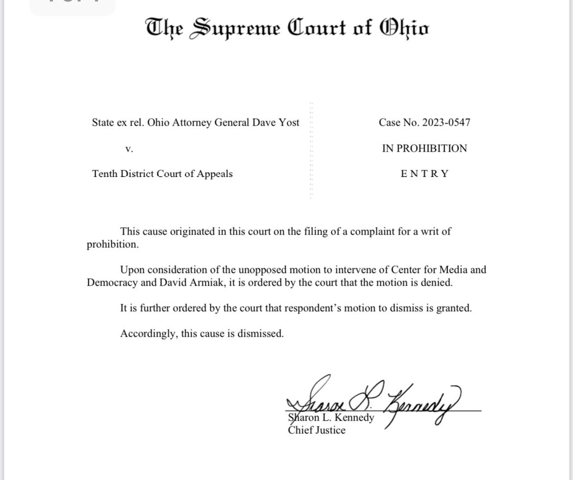 And with the assistance of your tax dollars, that outside counsel won the case—the Court dismissed Yost’s suit, the cost of which you also paid for.