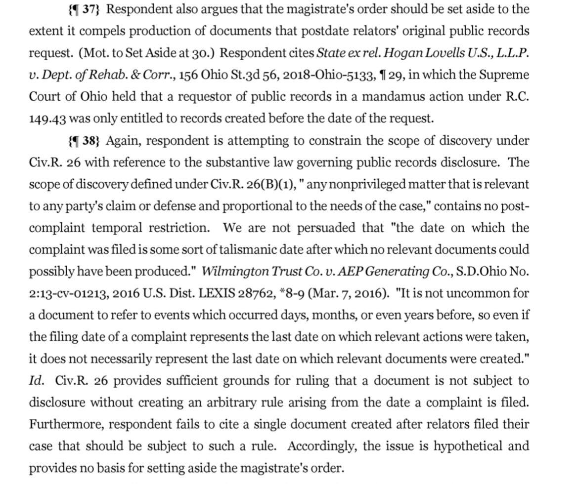 The Tenth District of Ohio—the appellate court—ruled that Yost could not avoid a deposition, and had to turn over documents to the present, which would include documents in the Jan. 6 timeframe. The Court directly rejected Yost’s argument that he should not have to turn over documents up to “the present,” which would include the January 6 timeframe: