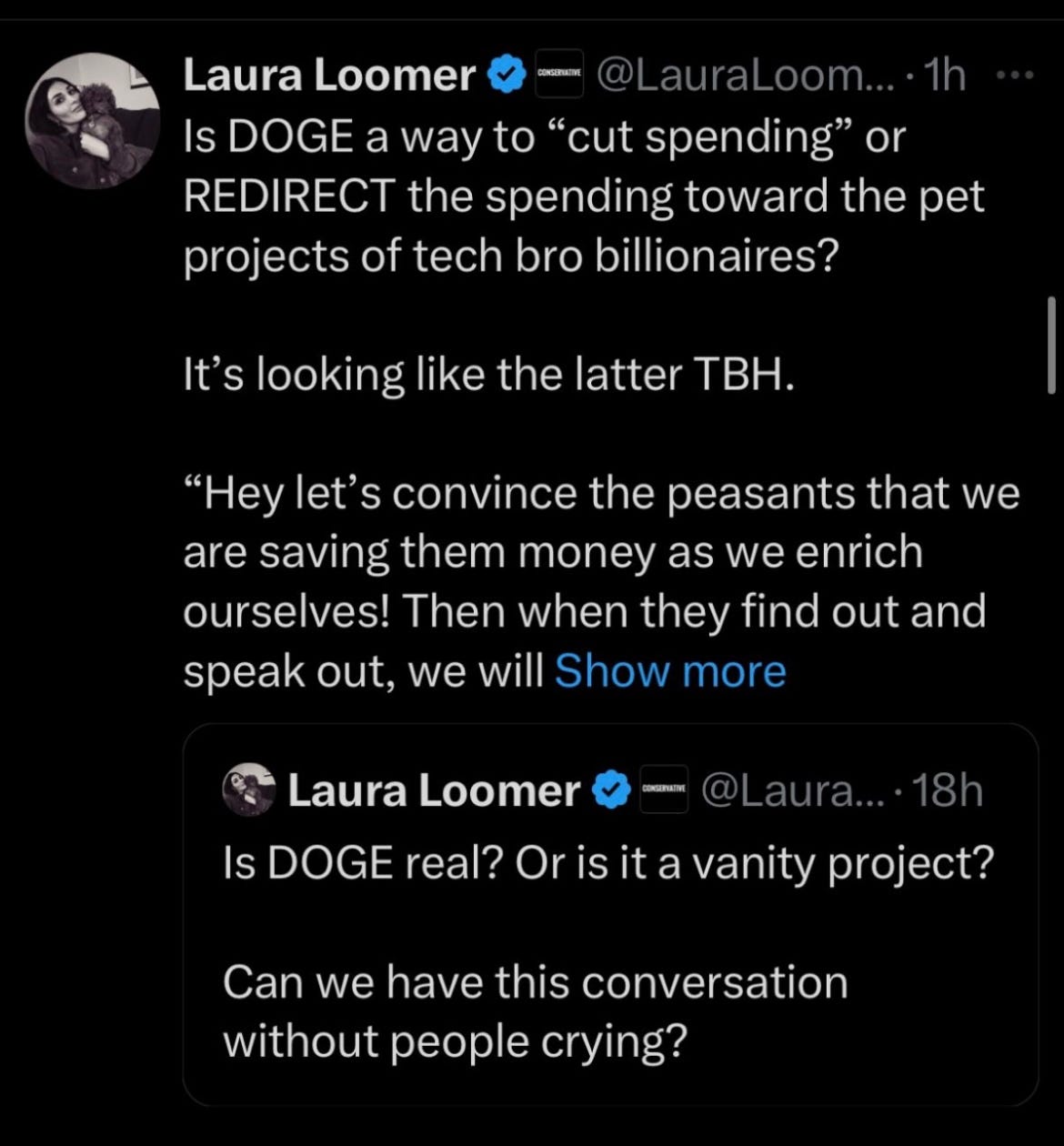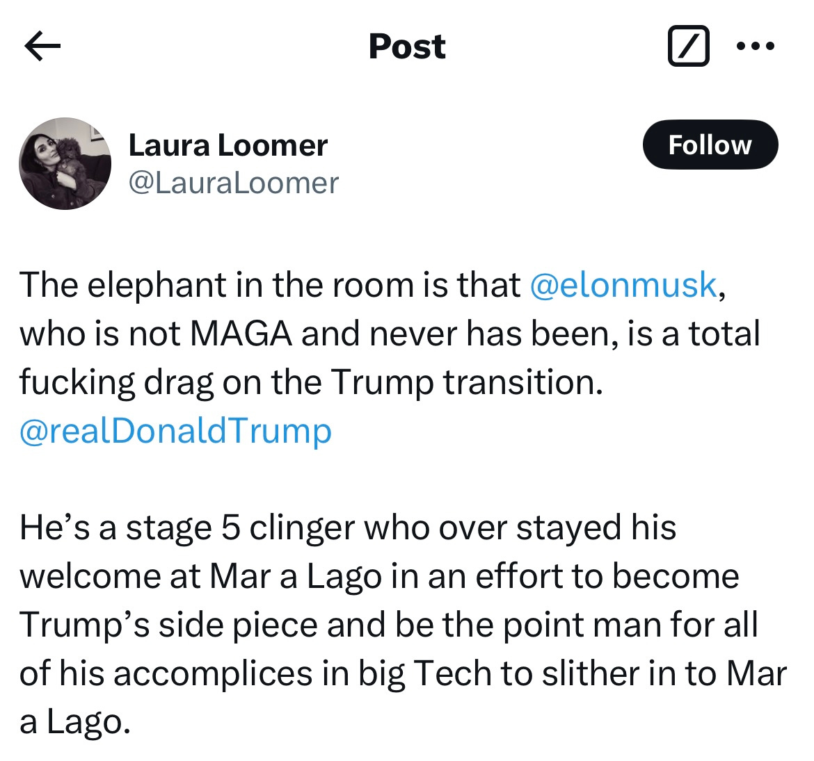 …including a series of rants by right-wing extremist Laura Loomer that Musk is a “stage 5 clinger” who is overstaying his welcome:
