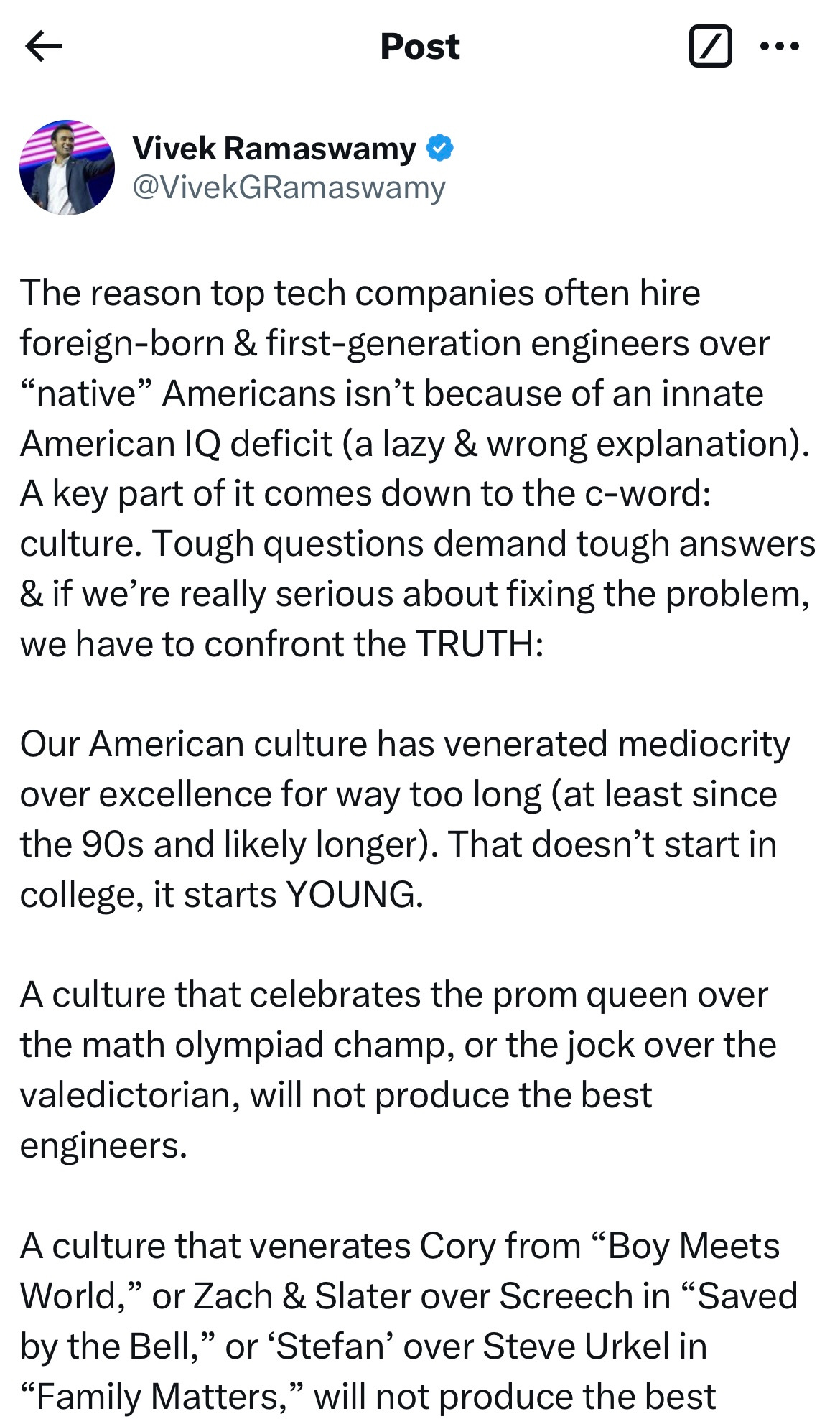 A week of of social media debate about tech companies hiring large numbers of employees from other nations, via HB-1 visas, exploded when DOGE co-chair Vivek Ramaswamy attempted to explain the trend. American culture is broken, he tweeted, marked by too many “Friends” reruns and prom queens and not enough admiration of characters such as Screech: