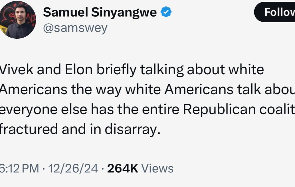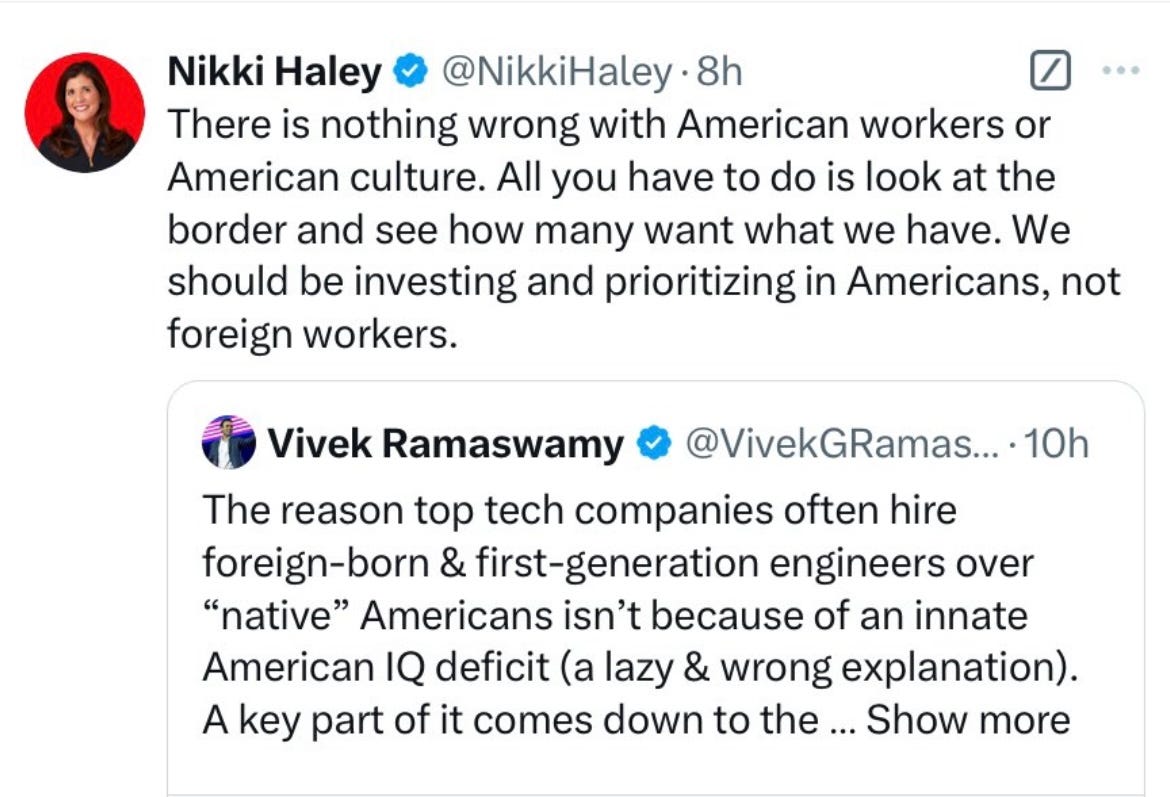 As for Ramaswamy, he might take a hard look at some of his allies in MAGA world. If he did, as he learned yesterday, he’d see that large parts of that world are not interested in immigration of any sort; and that the ethnicity and complexion of those immigrating triggers the fierce reaction to them entering America, not the reason or type of visa they used to immigrate here.