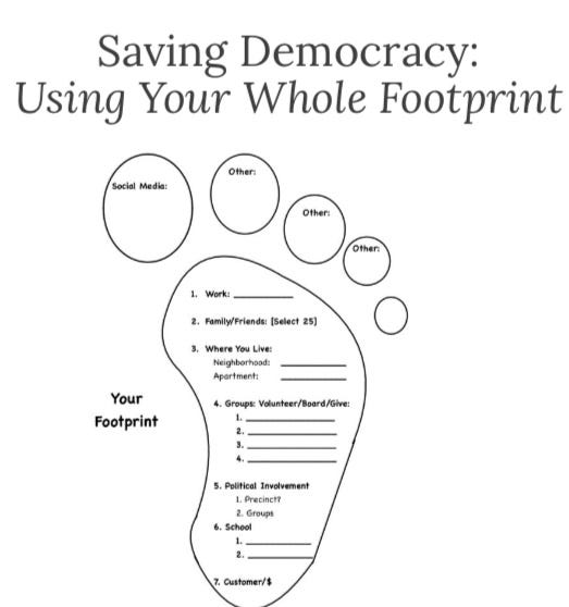 One other thing: think about groups you are part of—could all of their members also fill out a footprint like you just did? And if they did, wouldn’t the scale pro-democracy activity grow quickly? The answer is yes, so print out a bunch of footprints and bring them to your next meeting, pass them out, then have the group share what they’re each doing at future meetings. Or email them to your group before its next Zoom call.