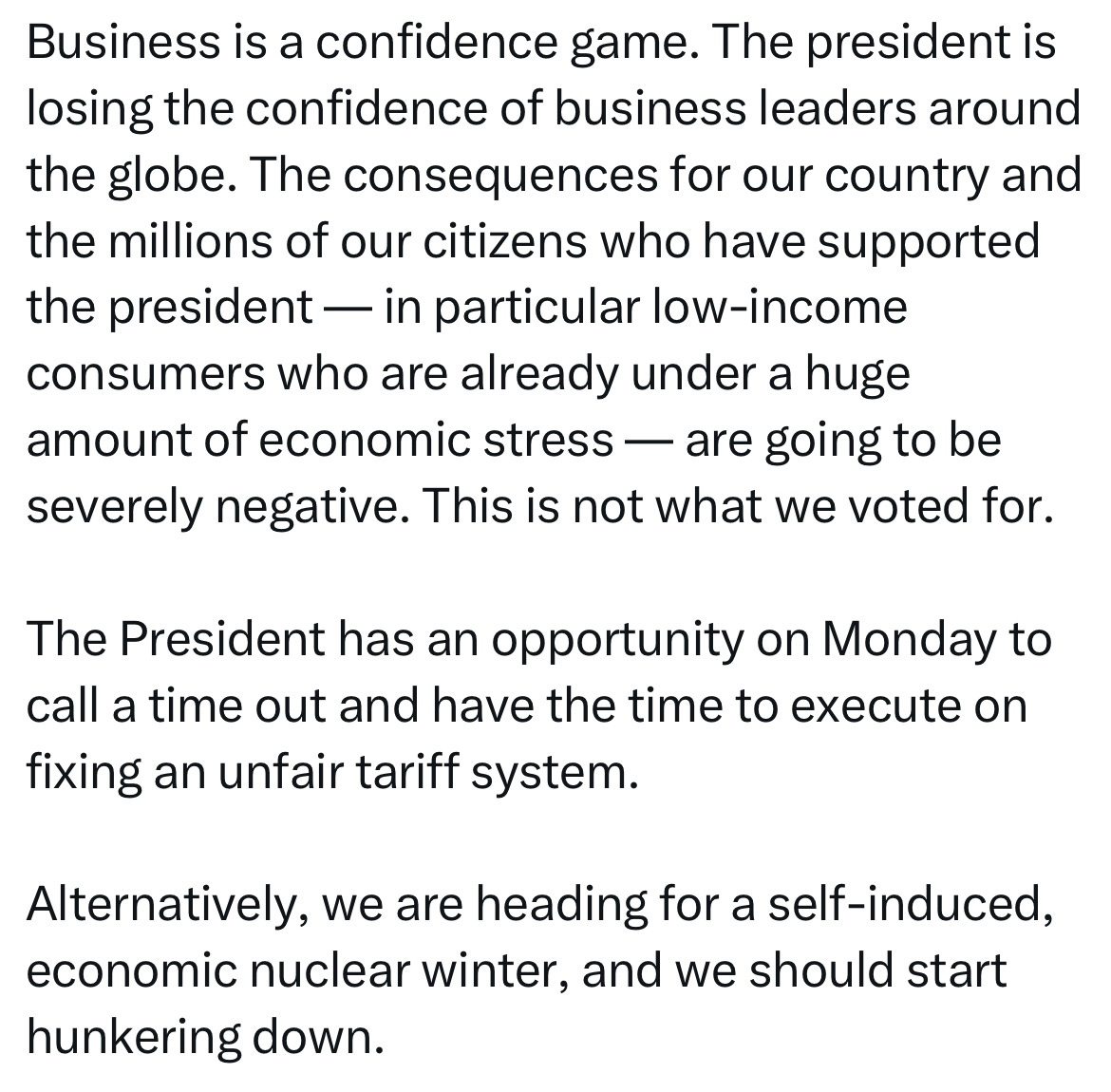 Read his words again: “we are heading for a self-induced, economic nuclear winter, and we should start hunkering down.”