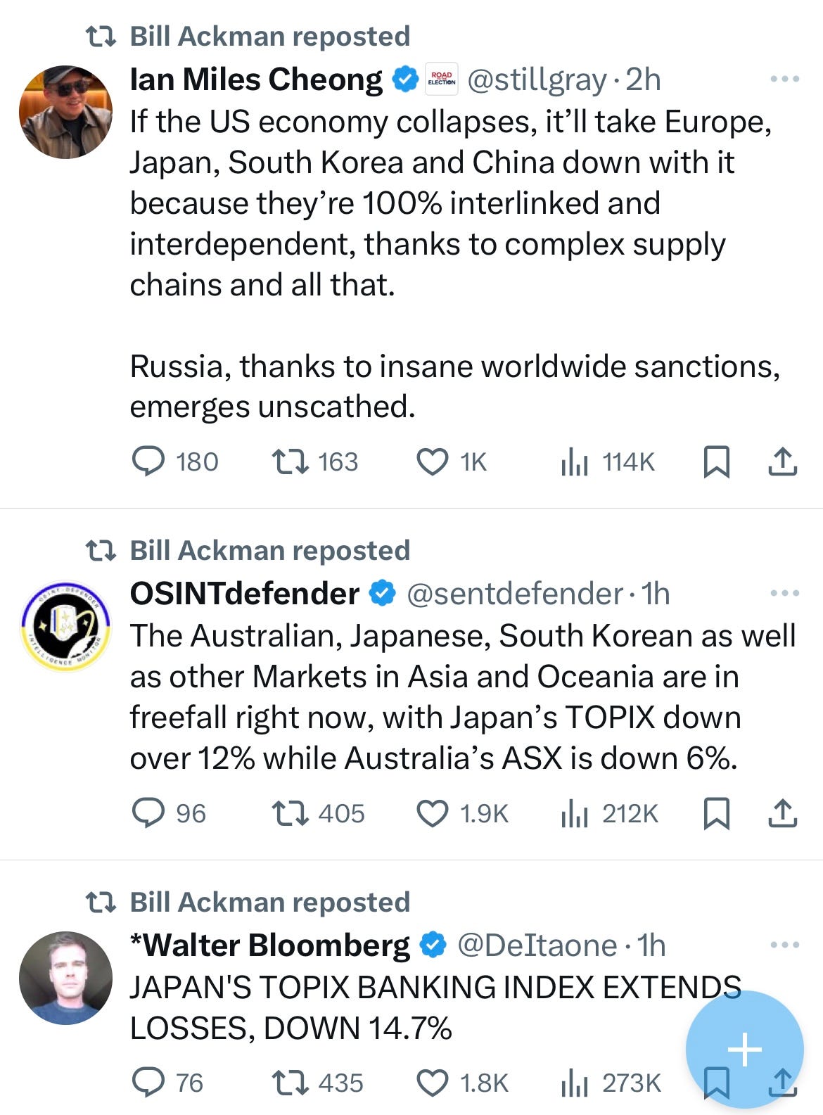 Then he retweets updates on how financial markets worldwide are collapsing, which they did all night.