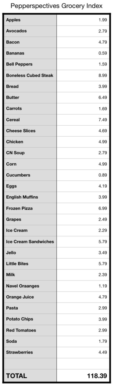 I call it my Pepperspectives Grocery Index: 30 standard items. Eggs, of course. Milk. Bread. Some cereal and soda. Ice cream. And a nice assortment of fruits and vegetables.