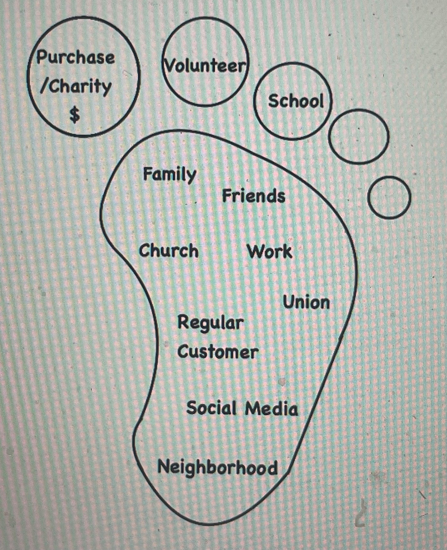 It starts with your family. And it includes your neighborhood. Your church. Your workplace. Your schools (present or past), or your kids’ schools. Maybe your gym, or the restaurant or coffee shop you go to most days. It includes organizations and civic activities you’re a part of—as a volunteer and supporter, or member. These days, for many, your social media activity is part of your footprint as well.