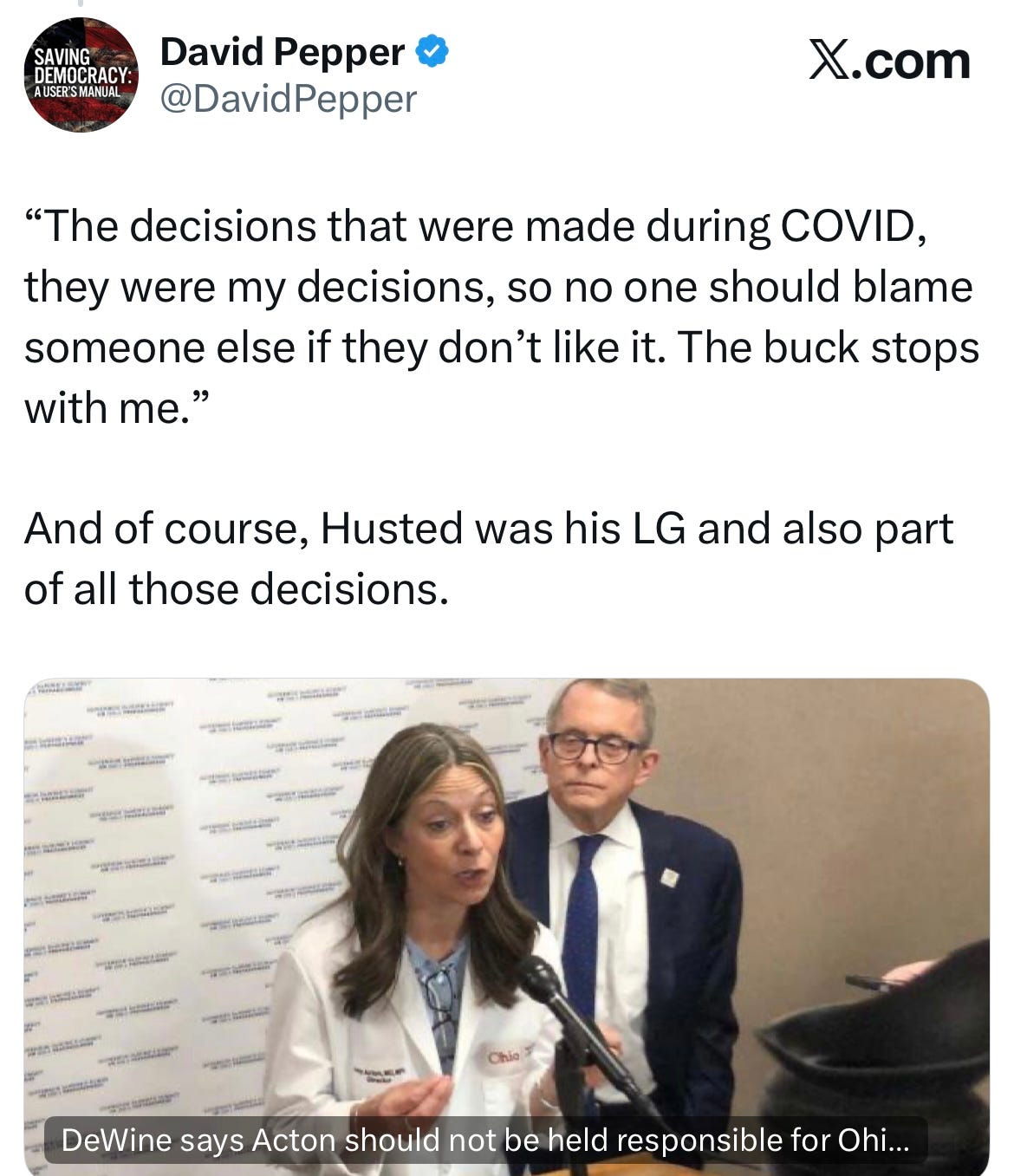 And in all the press conferences and announcements that took place, with millions watching, I never once saw Husted open an inch of daylight between what DeWine and he were doing or saying.