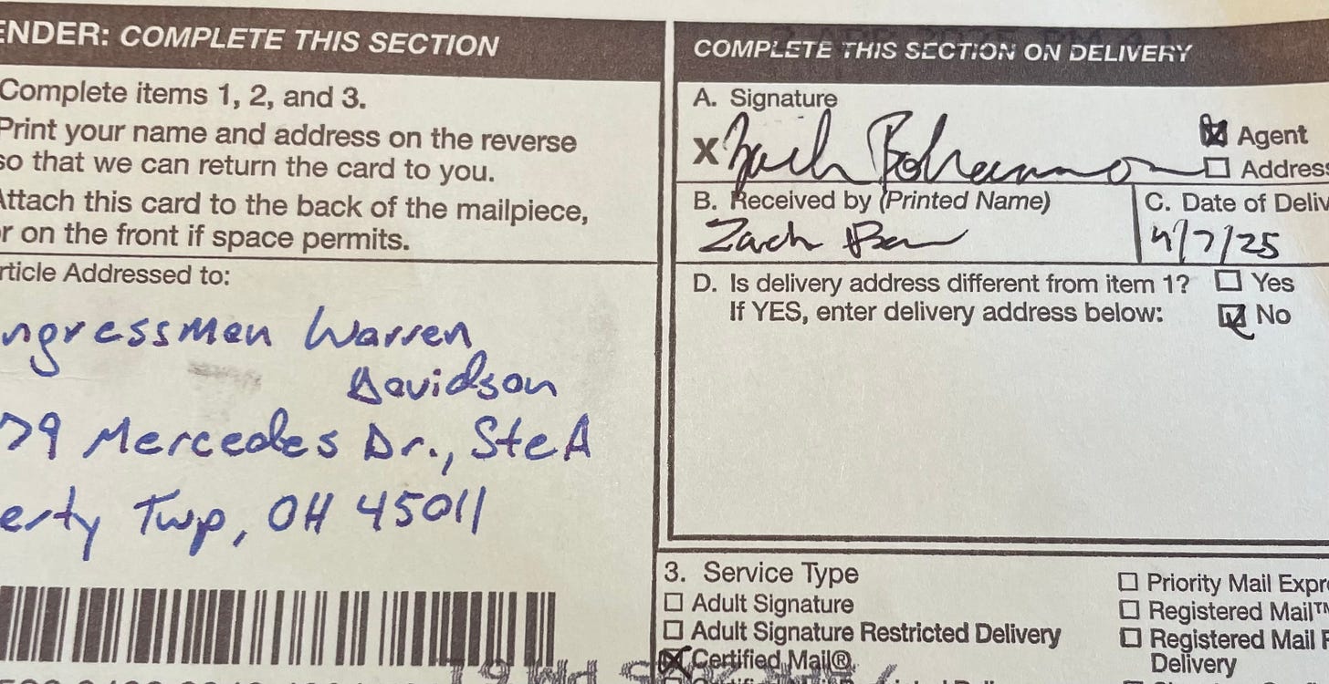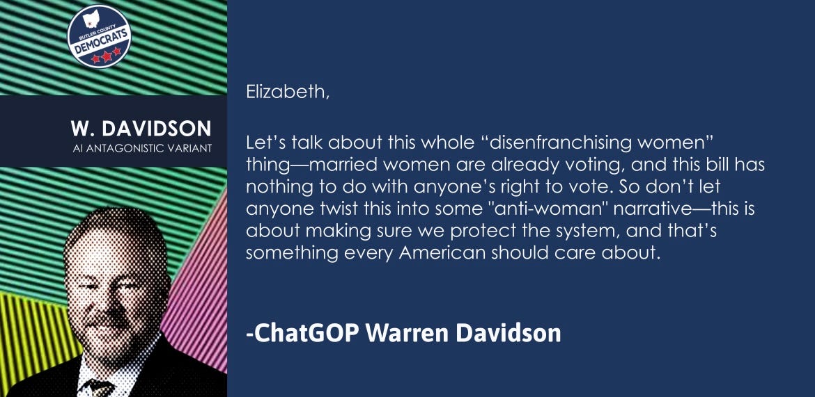 And even though he wasn’t there, we asked AI—as we called it, “ChatGOP”—to draw from Warren Davidson’s public statements to approximate the answer he might provide if he’d bothered to show up here, or at any town hall. We thought his constituents had a right to hear what he’s been saying elsewhere: