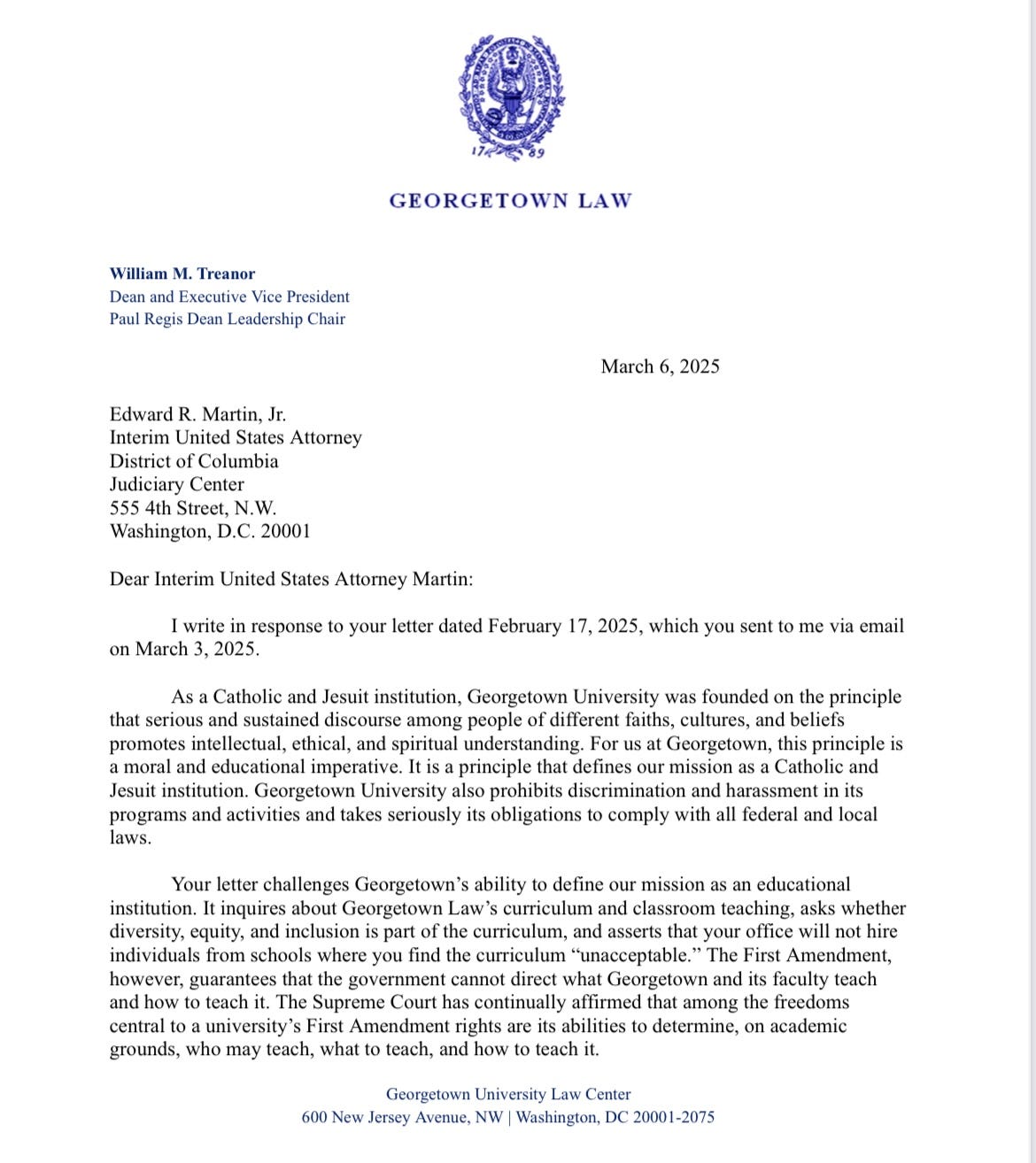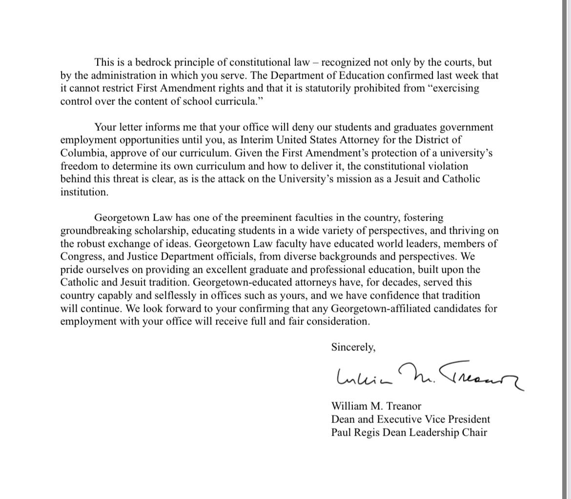 It’s the letter from William Treanow, the dean of Georgetown Law School, sent in response to the Trumpy US Attorney of the District of Columbia who said he would not hire students from Georgetown. (I actually spent a law school summer in that office—and one of the best attorneys I worked with there was a Georgetown law student).