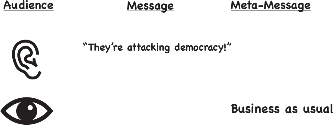 I dedicated part of a chapter in “Saving Democracy” to the importance of actions matching our words. Because the inconsistency between messages we verbally communicate every day, and the “meta messages” our actions or inactions communicate every day, and/or tone, can do great damage to the cause.