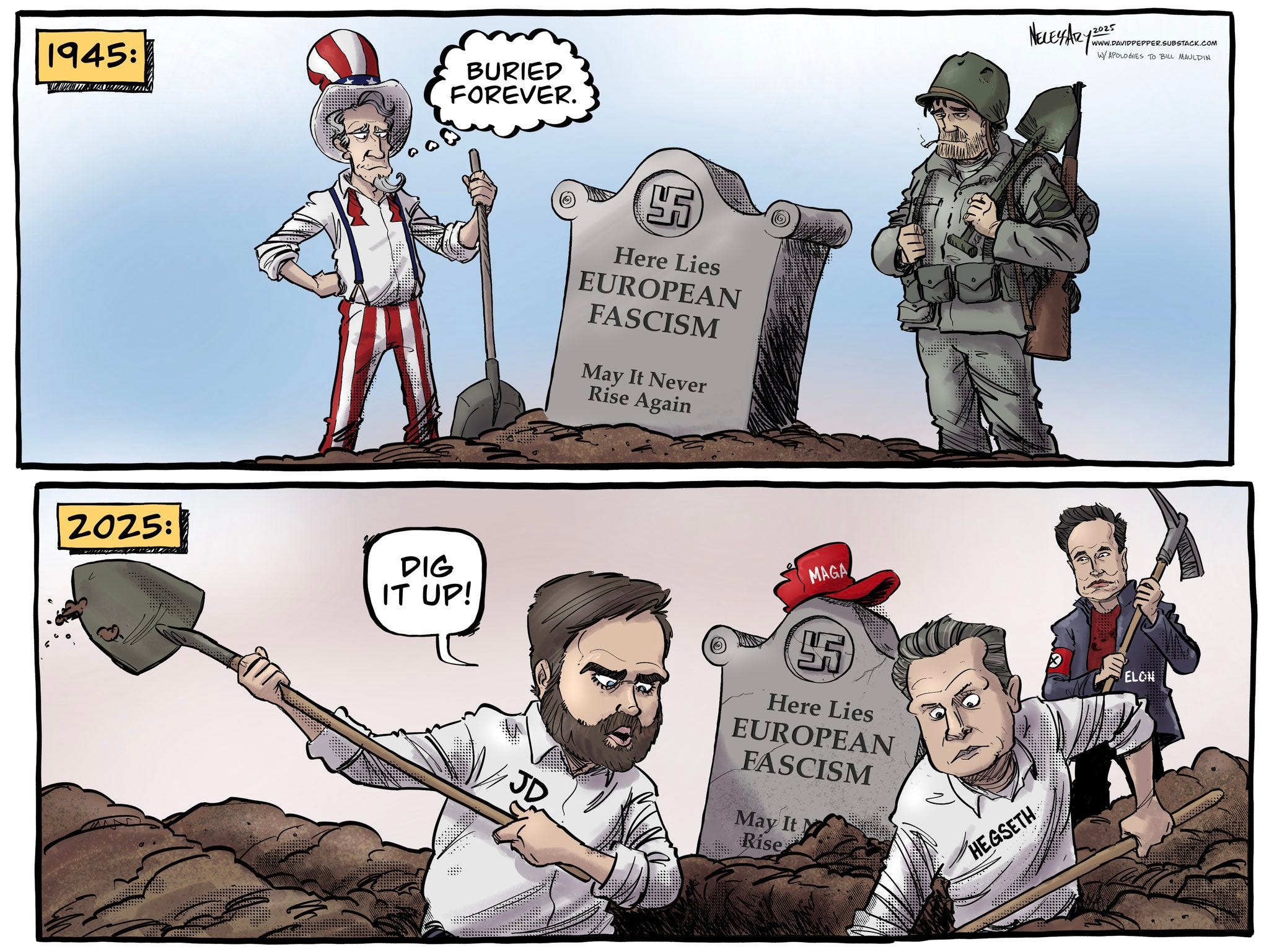 As Kevin’s cartoon captures, Vance’s speech the other day, followed up by his visit with the far-right German party, unearthed horrible legacies from the past.