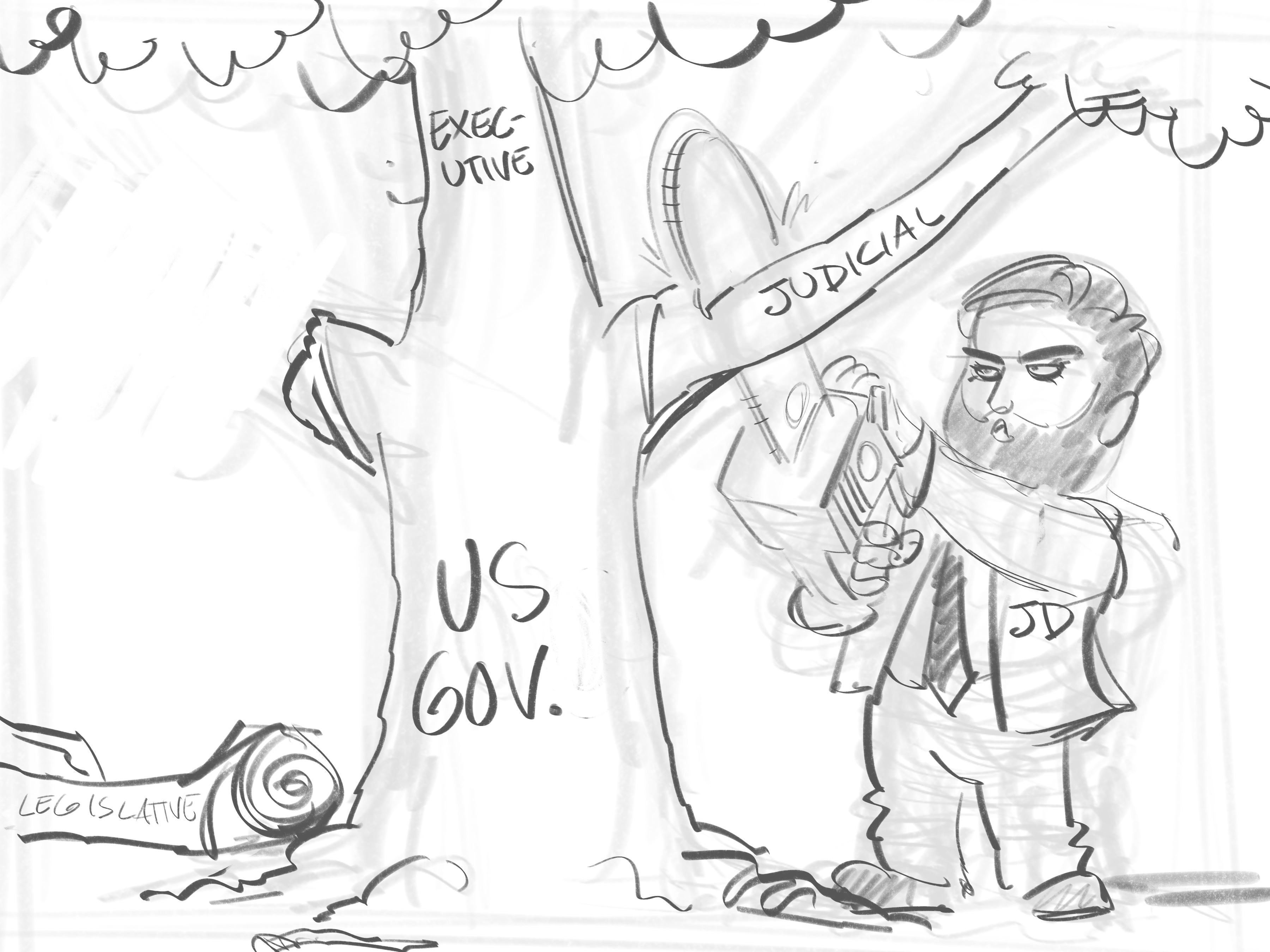 The final cartoon fell into place quickly. I used the idea of the three branches of government and drew them sprouting from a tree, and had JD Vance severing the legislative and judicial branches with a chainsaw. Vance was Trump's vanguard, advancing the (very unlawful) notion that Trump does not have to obey judges. Vance does know better. He's a Yale Law graduate. He just doesn't care. It seemed fitting that he be the one using the chainsaw.