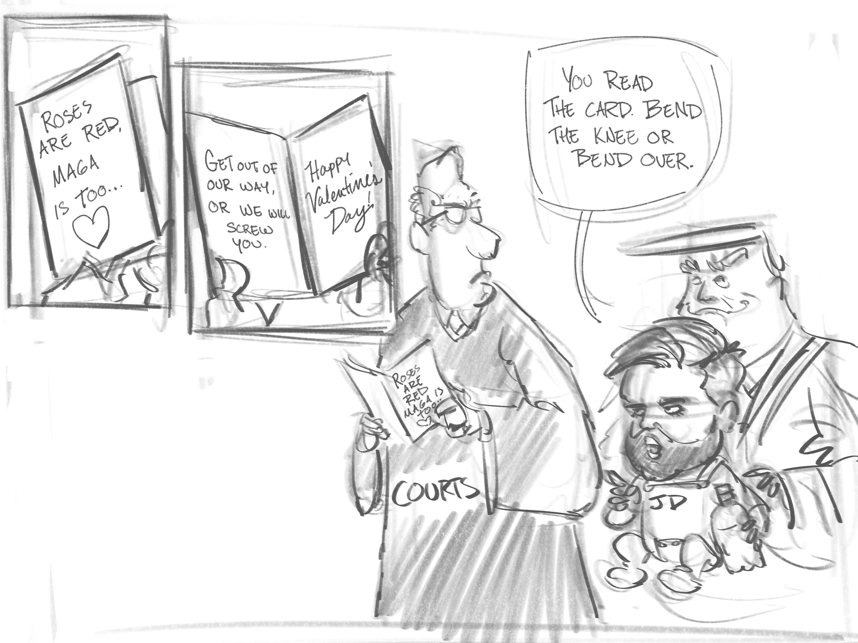 I had several cartoon ideas about Trump's current battle with our legal system. I hitched the first sketch to Valentine's Day, trying to marry the cartoon topic with the then-impending romantic holiday. In the first two panels we see a closeup of a Valentine's Day card featuring a riff on the ol' "Roses are red" poem. But instead of sweet nothings, the card is actually a threat to a judge, demanding that he fall in line. Finally, we see the judge scowling as he looks over his shoulder at the card's sender, Trump.