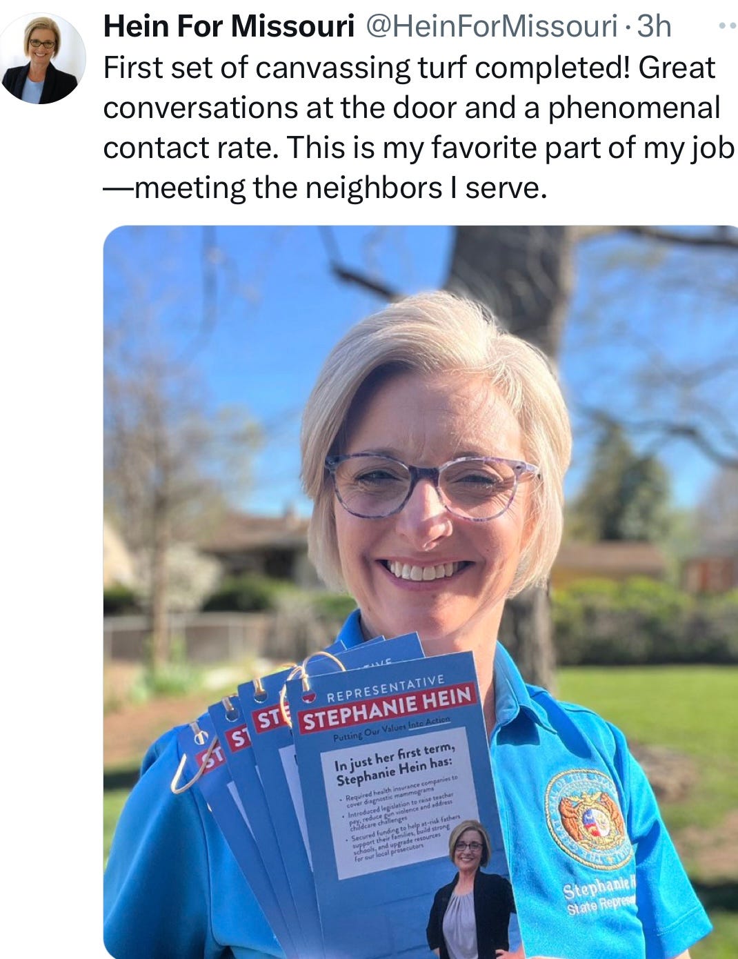 And the reason Stephanie is in office in the first place (her first term as state rep.) is because of all the tireless canvassing she did in 2022, where she took on, outworked and defeated an incumbent in a district Trump won in 2020. Her win—by 203 votes!—was a shock to the Missouri GOP, and the only “flip” from red to blue in Missouri in 2022.
