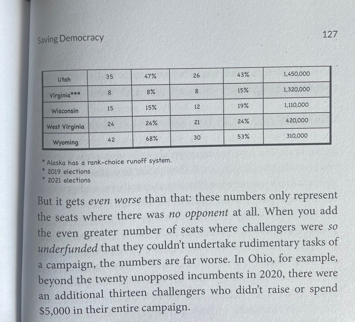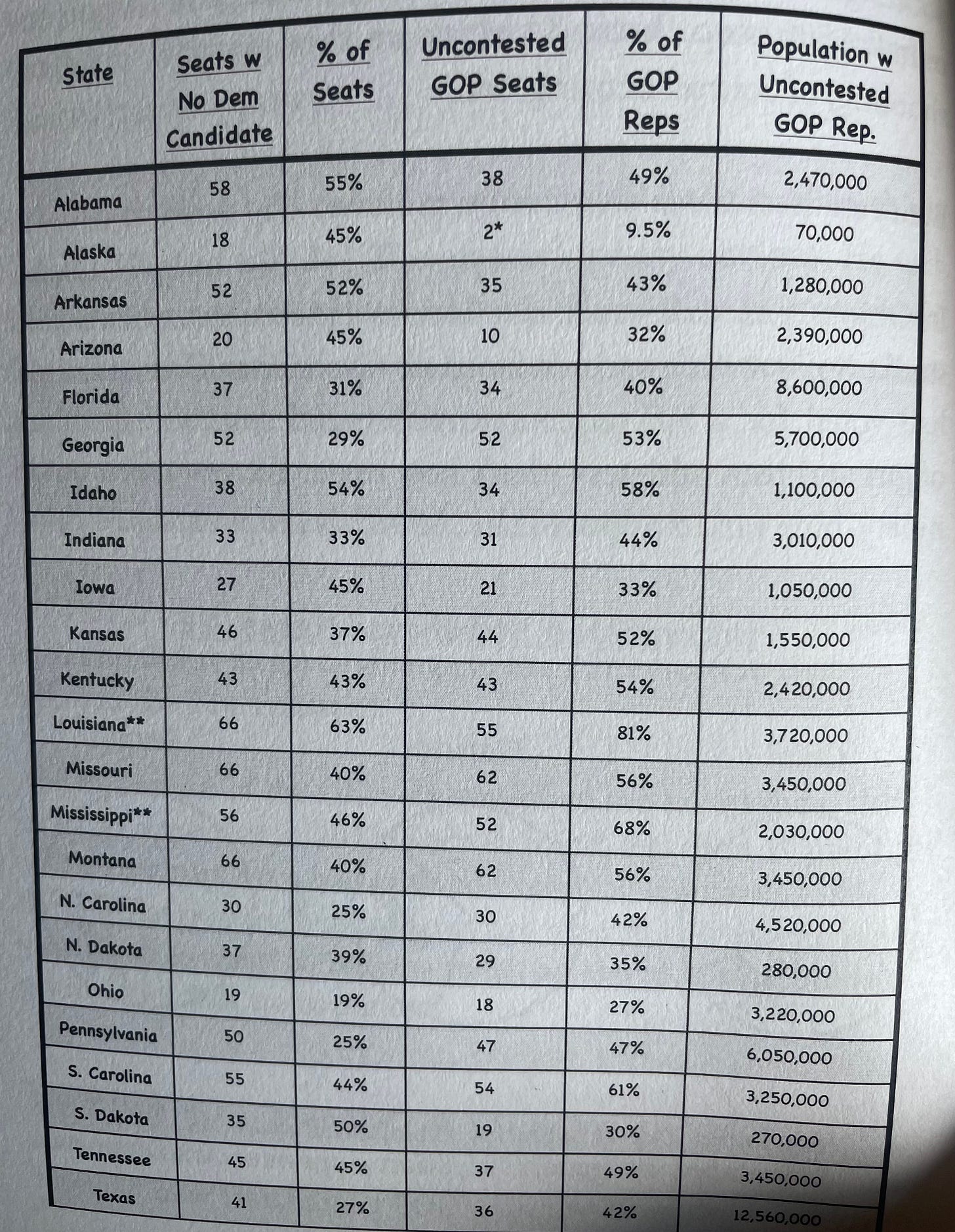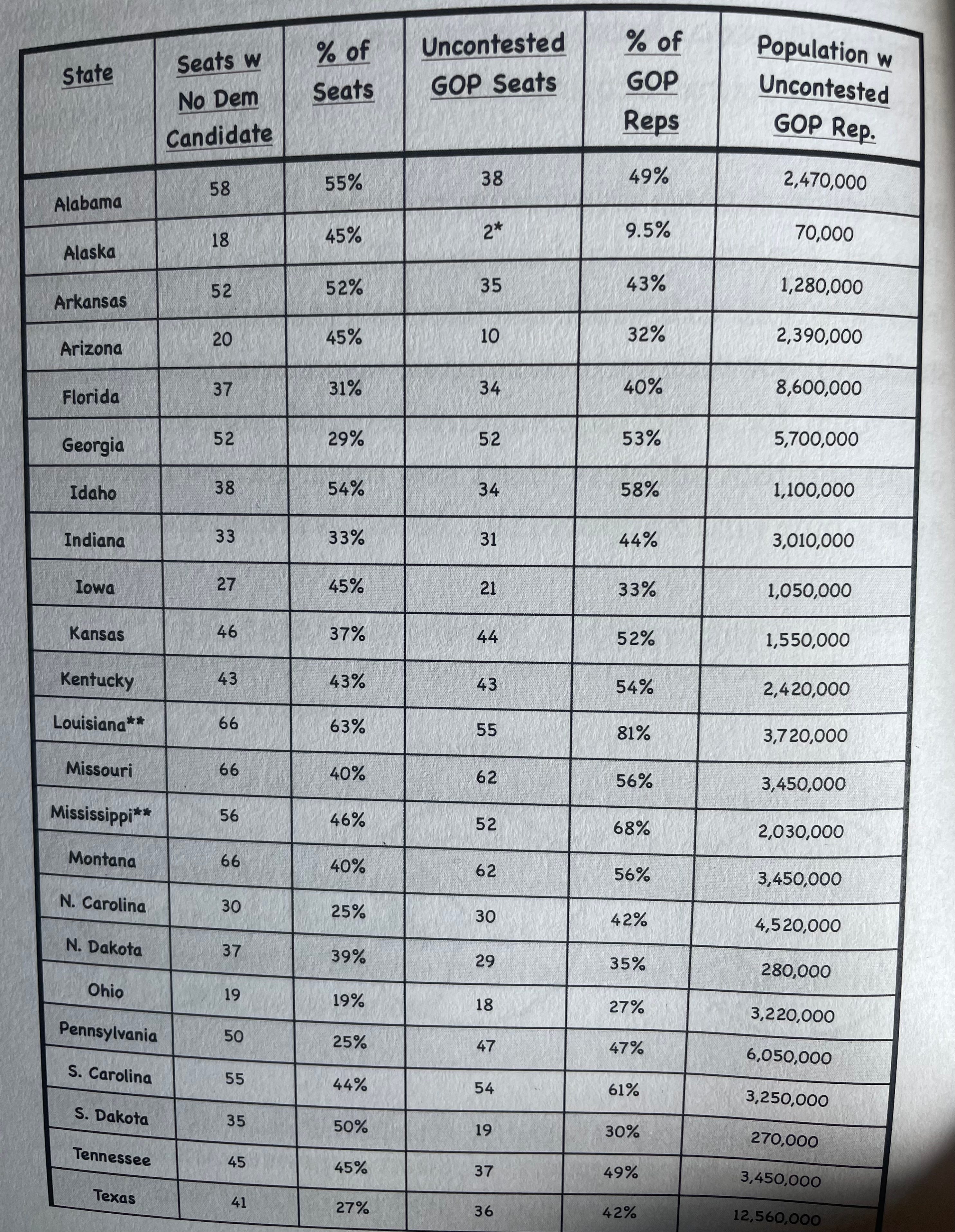 Here’s a chart from my book “Saving Democracy” detailing just how much of a crisis this is. These are the percentages of GOP reps who ran uncontested in the most recent statehouse elections in red states: