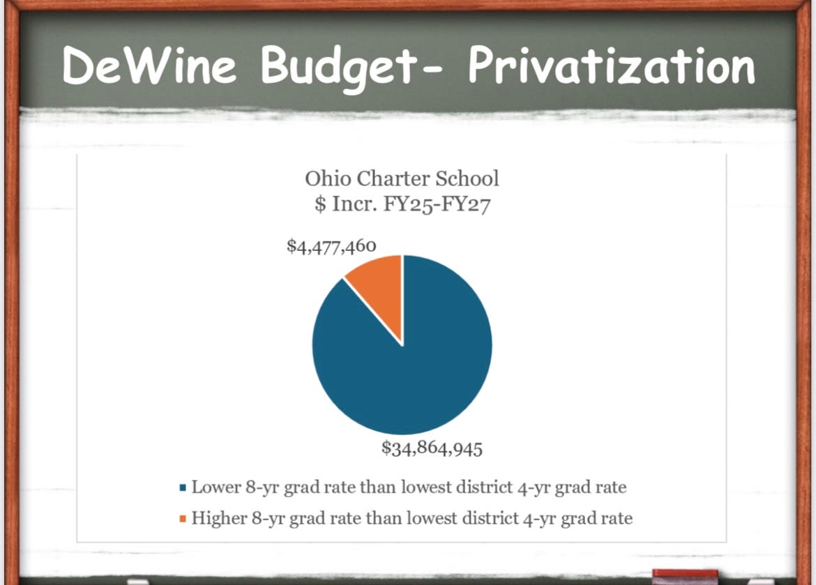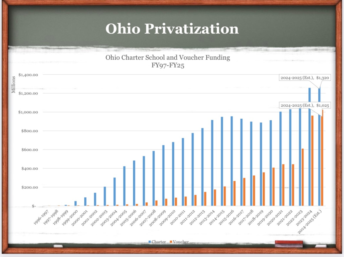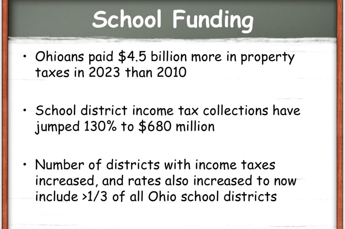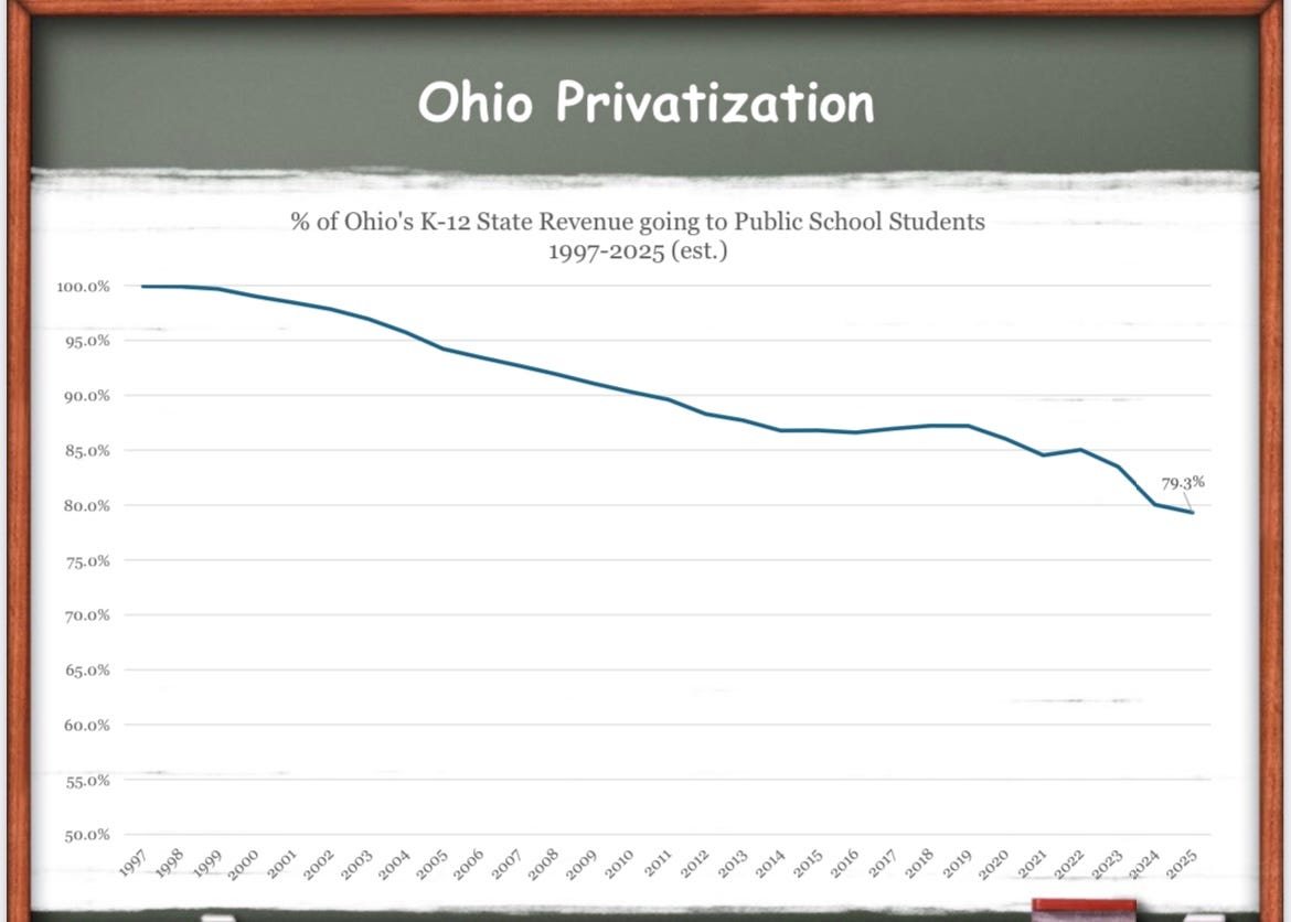 With the help of former Ohio legislator and public school advocate and expert Steve Dyer (sign up for his Substack here; it’s invaluable), I’m going to present Ohio as a case study of how these right-wing privatization schemes not only destroy public schools and overall outcomes, but also lead to skyrocketing property taxes at the local level (ie. it’s not your local government’s fault—it’s your states' politicians).