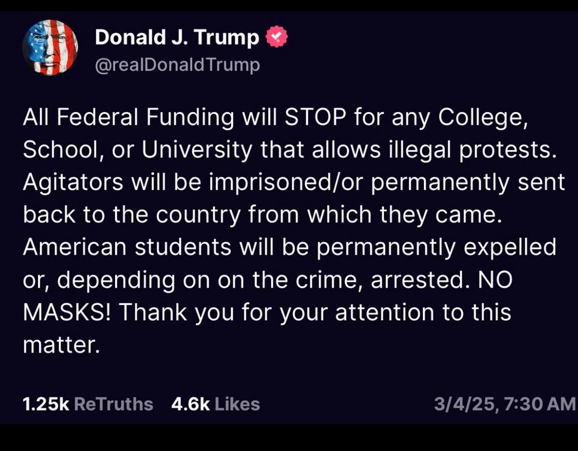 Far more dark than even the evening’s speech, Trump engaged in a different autocratic step earlier in the day, threatening colleges and universities that “allow illegal protests.” He threatened to defund such schools, and to arrest and/or deport “[a]gitators” involved in protests.