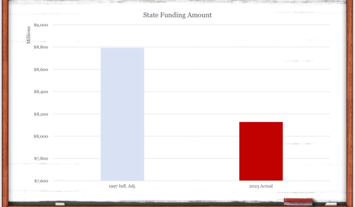 Adjusted for inflation, the amount of state dollars NOW going to public schools is considerably less than when the Supreme Court issued that ruling
