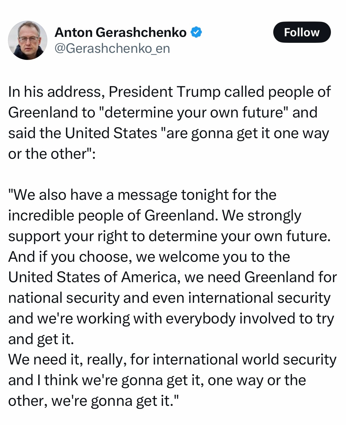 In addition to the lies, the atmosphere and tone felt like an autocrat’s speech. Take this quote about Greenland, for example, voicing an attitude that reflects Putin’s approach to the world—just more openly and aggressively.