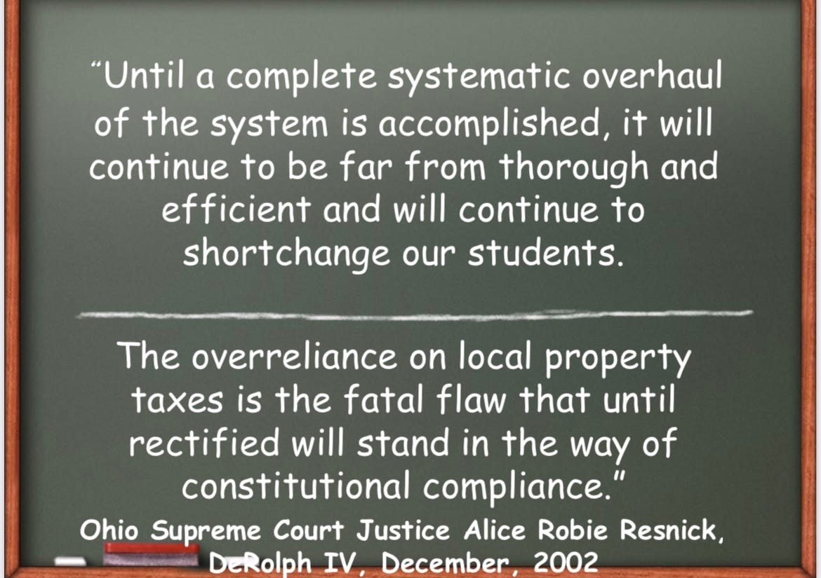 Ohio has long had a problem that the state short-shrifted public school funding, relying too much on local property taxpayers to foot the bill, which also creates unequal results. This was the foundation of the Ohio Supreme Court decision in 1997 (called DeRolph) that struck down Ohio’s school funding system as unconstitutional: “Until a complete systematic overhaul of the system is accomplished, it will continue to be far from thorough and efficient and will continue to shortchange our students.”