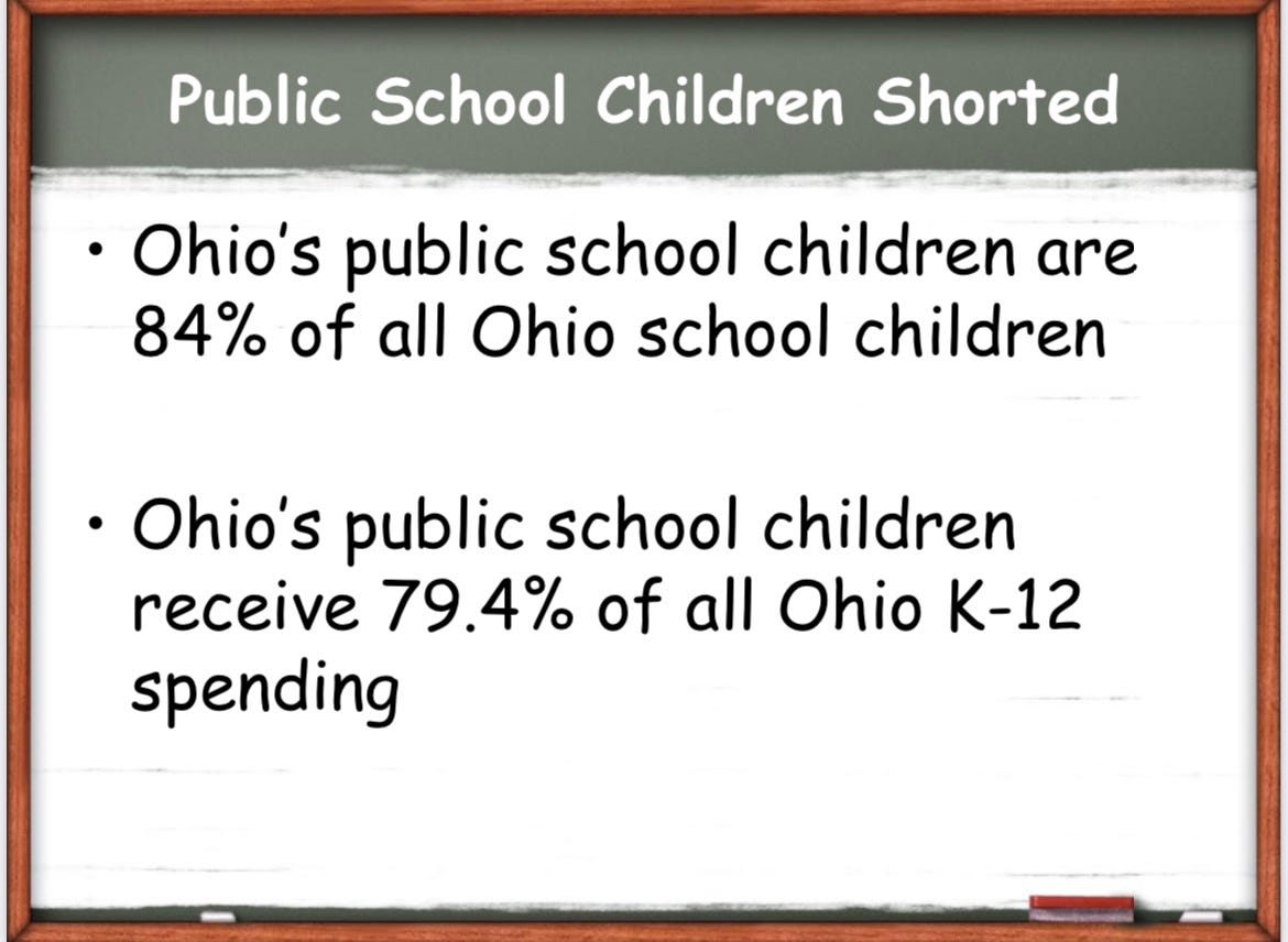 So even though the entire system remains less funded than the Ohio Constitution requires, public school students receive a lower percentage of funds than their percentage of the education population: