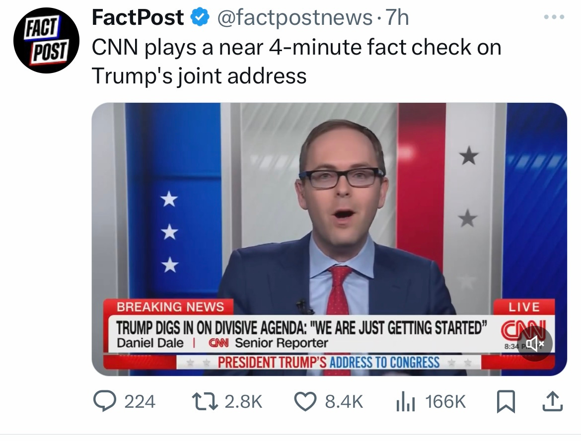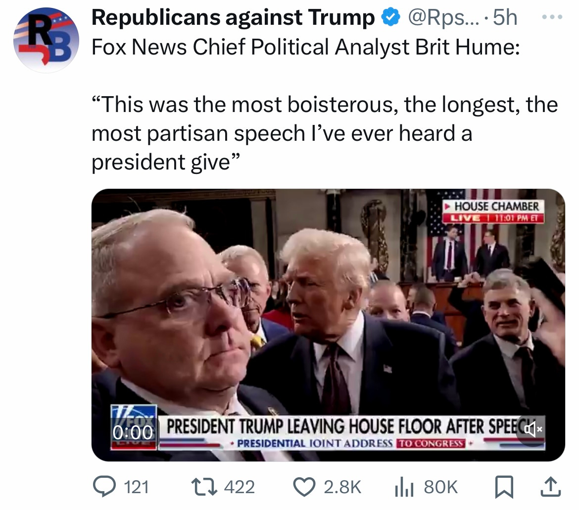 Trump’s address to Congress was, according to even the Fox News analyst Brit Hume, “the most partisan speech I’ve ever heard a president give.” And it included a non-stop litany of lies and disinformation, so much so that it took CNN’s fact-checker an entire eleven minutes to set the record straight. (We now have two responses to these addresses: the Democratic response, and the even longer fact check). Then there were the things not said—the “reverse lies,” I’d call them—such as claiming to be pursuing cancer cures when it fact Trump is making cures less likely by gutting NIH: