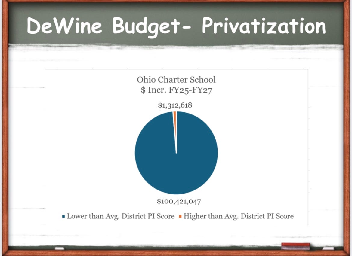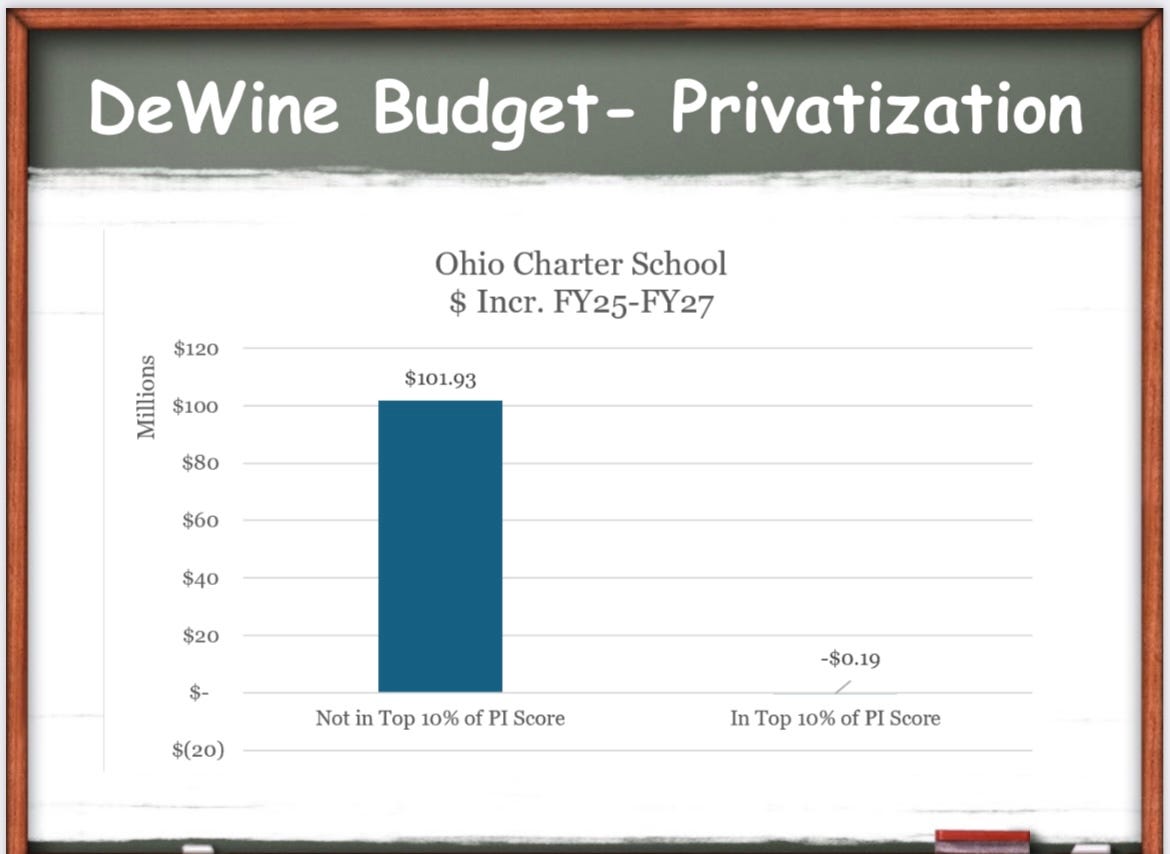 Here, for example, is the current DeWine proposed budget. Even though it is clear which charters are performing well and which aren’t (most), the state affirmatively chooses to fund those that perform worse—worse than public schools, and worse than the better performing charter schools (which receive less money).