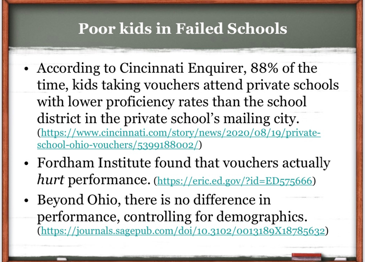 First, for vouchers, there is zero accountability for how these funds are being spent. We have no idea where the money goes, and no way to assess (or assert any control over) how these schools are performing. The politicians in Columbus refuse to seek any accountability on this spending, and refuse to even require these voucher recipient schools to take the same tests as public schools. So it’s now more than $1 billion going out the door annually in a wholly unaccountable way. To make matters worse, this amount of money is fueling a new industry of low-flying for-profit schools that accept vouchers, allowing them to make profits while knowing they will face no accountability for what they do with these funds.