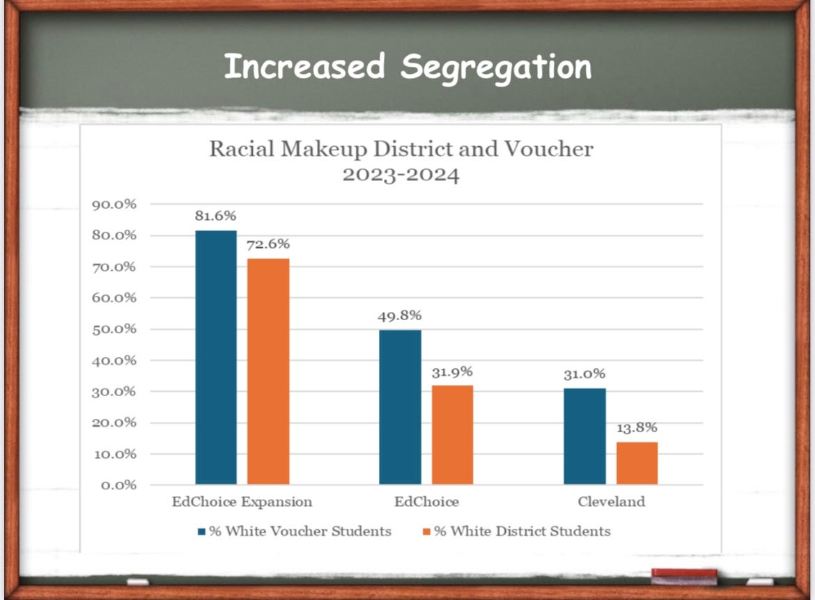 In addition to draining funds from public schools, and delivering worse results, the privatization of Ohio schools is also resegregating education in Ohio. The students opting to use vouchers turn out to be disproportionately more white than the student population of those districts.