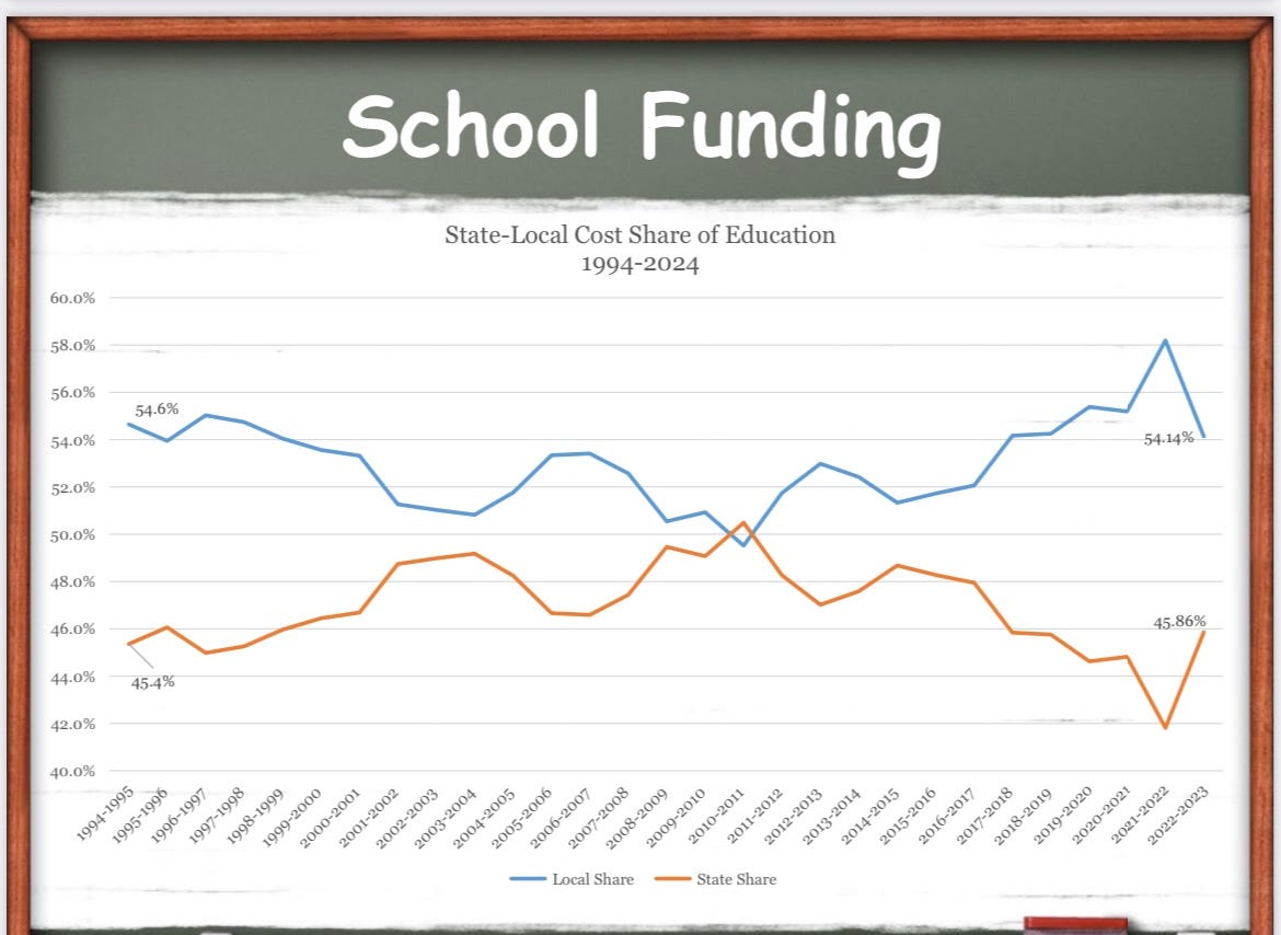 These are precisely the budget tricks that, together, have led to an overall decrease in school funding, worse outcomes and higher property taxes—year after year.