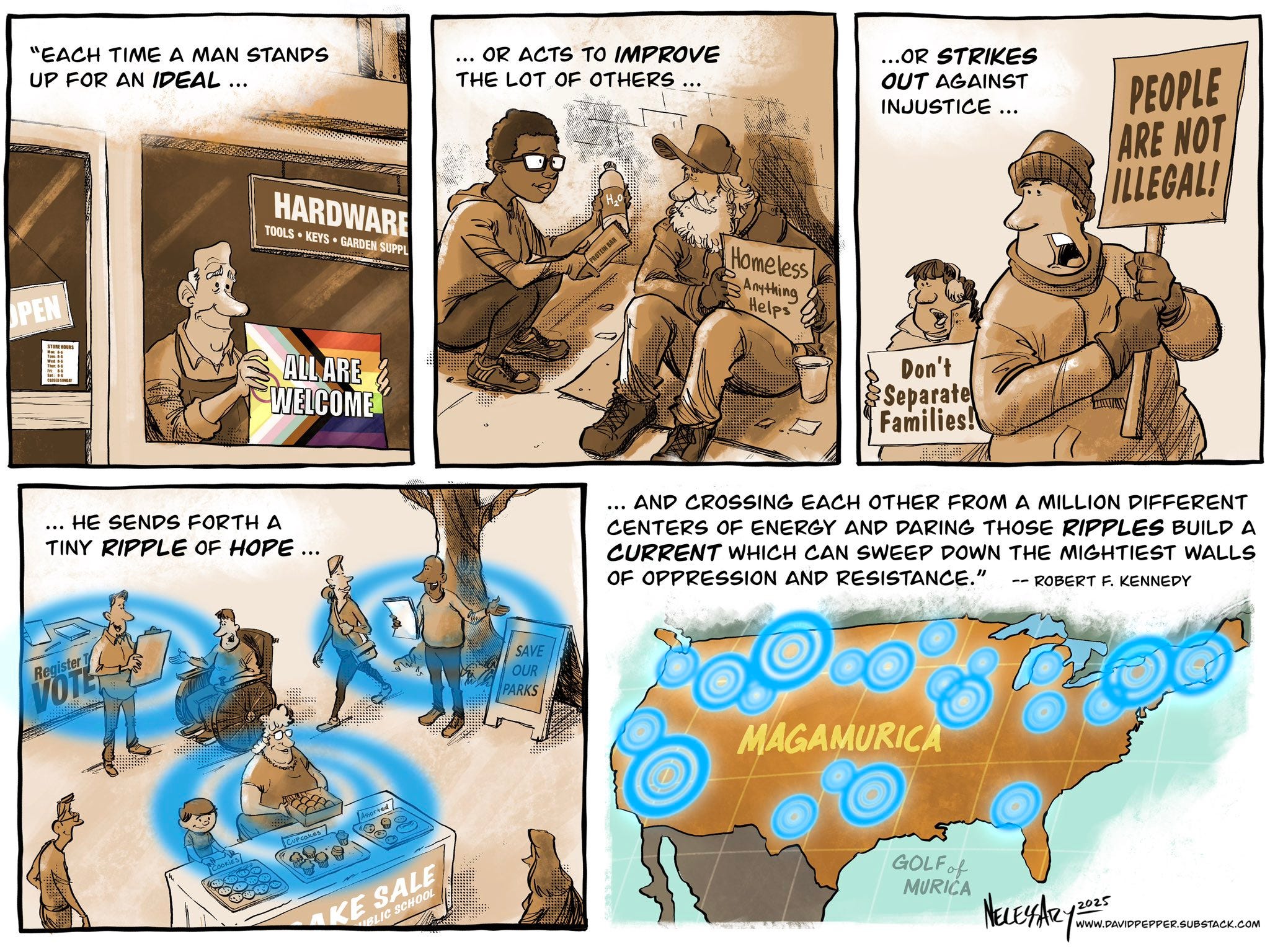 On the positive front—about 50 days in, Americans horrified by all this began to wake up, stand up and speak out. And that gives us Kevin’s most hopeful cartoon of the 100 days: