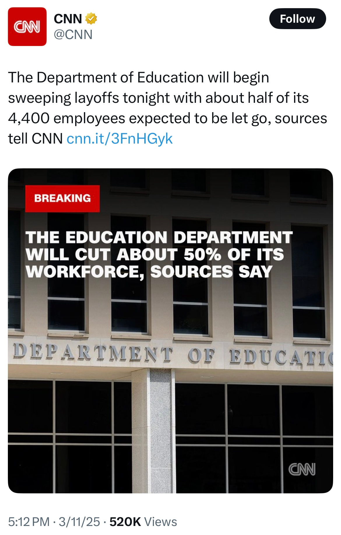 The Trump Administration announced that almost half of the 4,100 employees of the Department of Education have been laid off, and that Dept. of Ed. headquarters were to be vacated by 6 p.m.