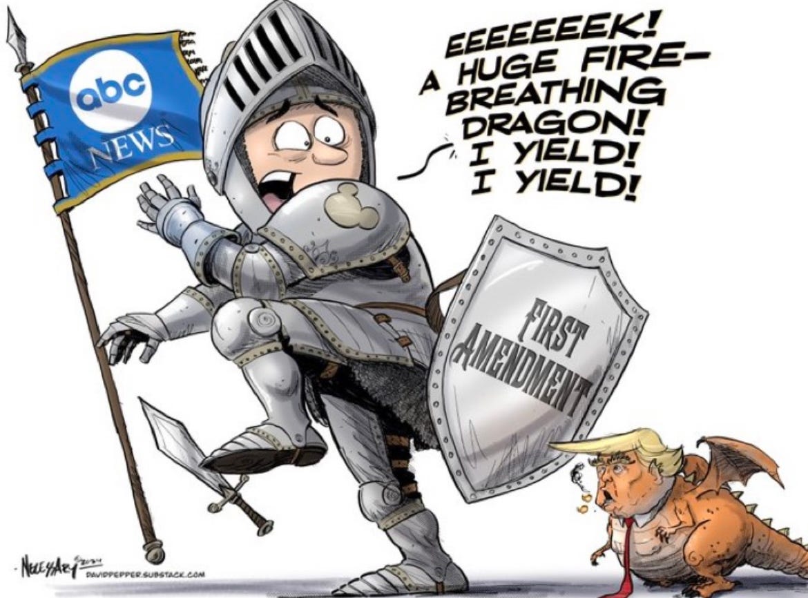 The trend of major media outlets—from The Washington Post to well-known MCNBC hosts—kowtowing to Trump’s bullying continues. The latest took place with ABC settling a defamation suit by Donald Trump, stemming from George Stephanopoulous’ reporting on the E. Jean Carroll lawsuit—using the exact same word (“rape”) that the judge who had overseen the case had used. To settle the case, ABC will now donate $15 mullion to Trump’s presidential library, and $1 million in legal fees.