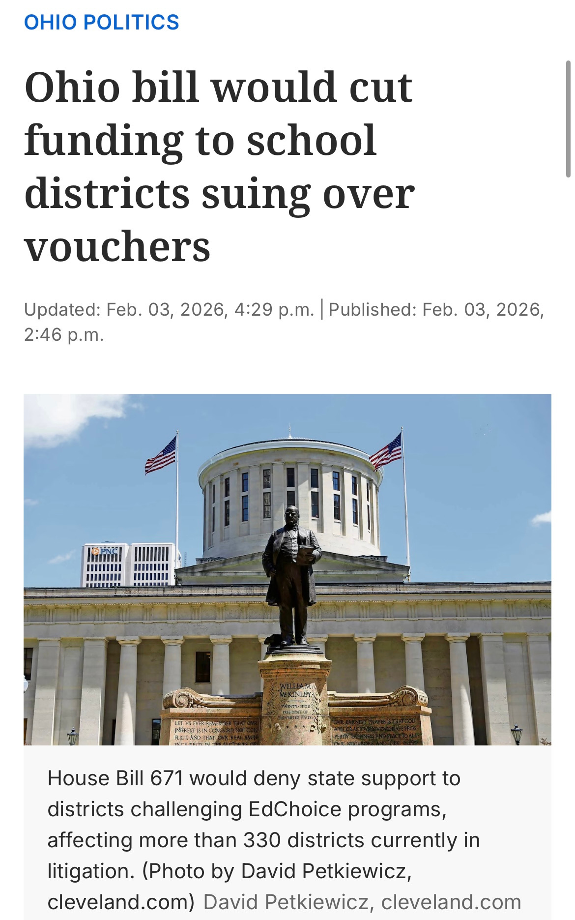 Introducing a new bill that threatens all the school districts who have exercised their legal rights to protect their constituents and students, and uphold the Ohio Constitution, will lose state funding so long as they stay in their (so far successful) lawsuit. According to the bill, “[t]he department of education and workforce shall release withheld funds to the school district only upon the termination of the legal action or the district’s withdrawal from the action.”