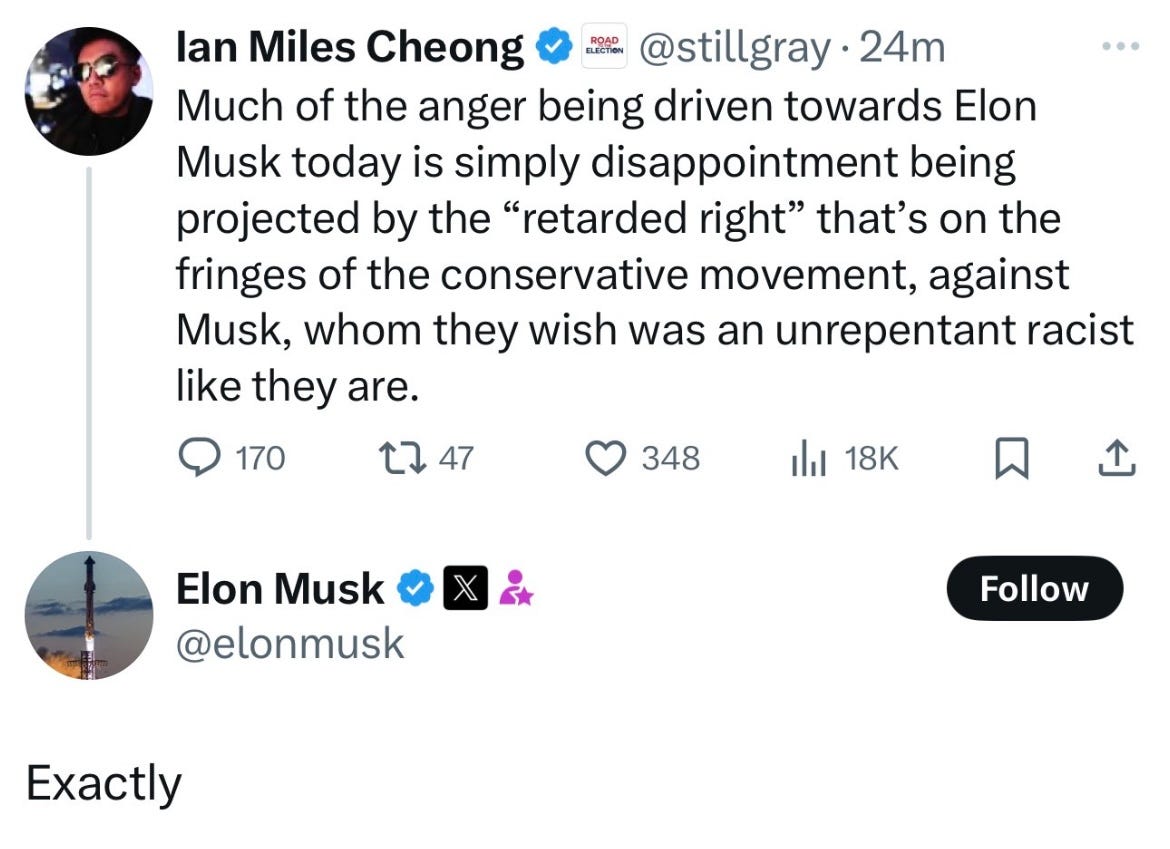 He then agreed with a tweet that called some in the MAGA movement the “retarded right.” (Honestly, it’s painful to even type the word in quotes).