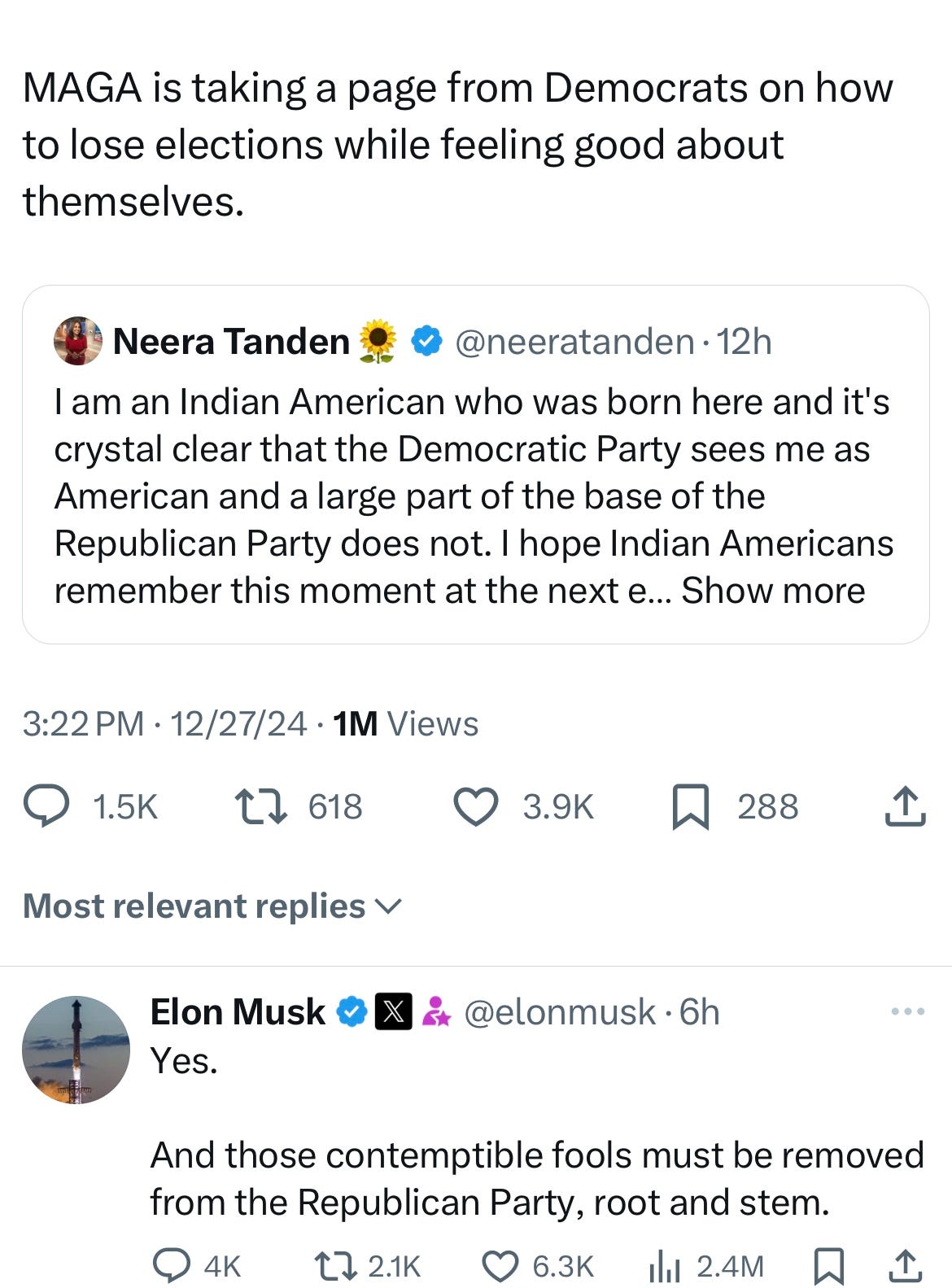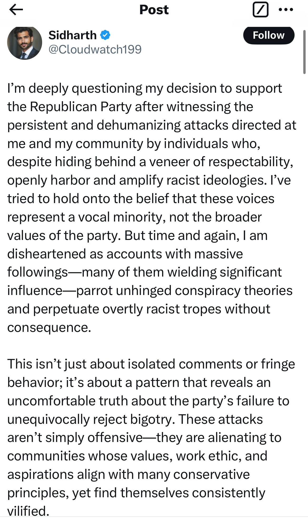 Some in the MAGA alliance expressed dismay at the “persistent and dehumanizing attacks” and the perpetuation of “racist tropes without consequence.” It seems to be a “pattern,” one disappointed commenter posted (between tweets of Elon in a Superman outfit), before asking: is this “an undercurrent that the party I unwilling—or worse, uninterested—to confront?”