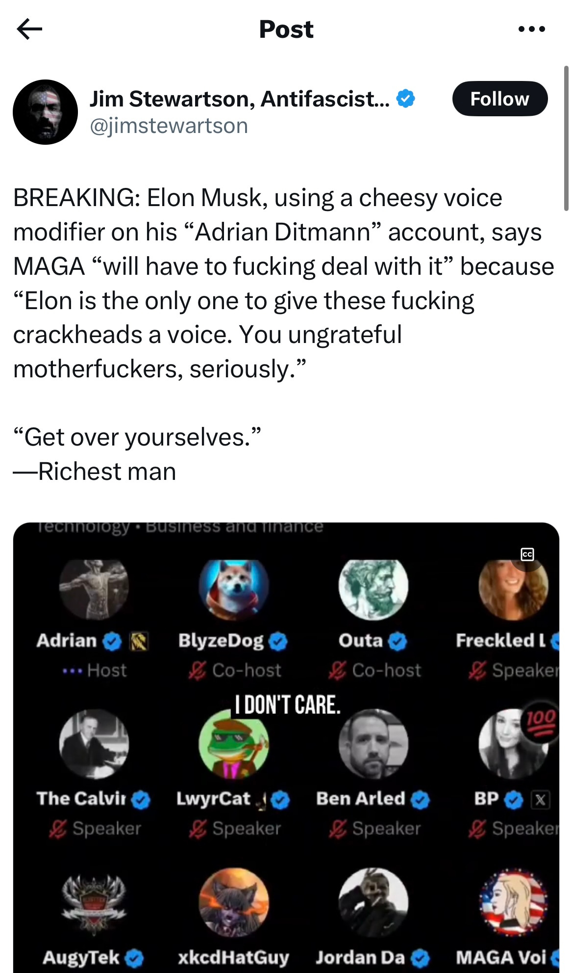 Incredibly, in some chat room where his new enemies were all whining about their new status, Musk appears to have joined under a false name (no, not John Barron) and lectured them for being “ungrateful mf’ers” for having amplified them all this time:
