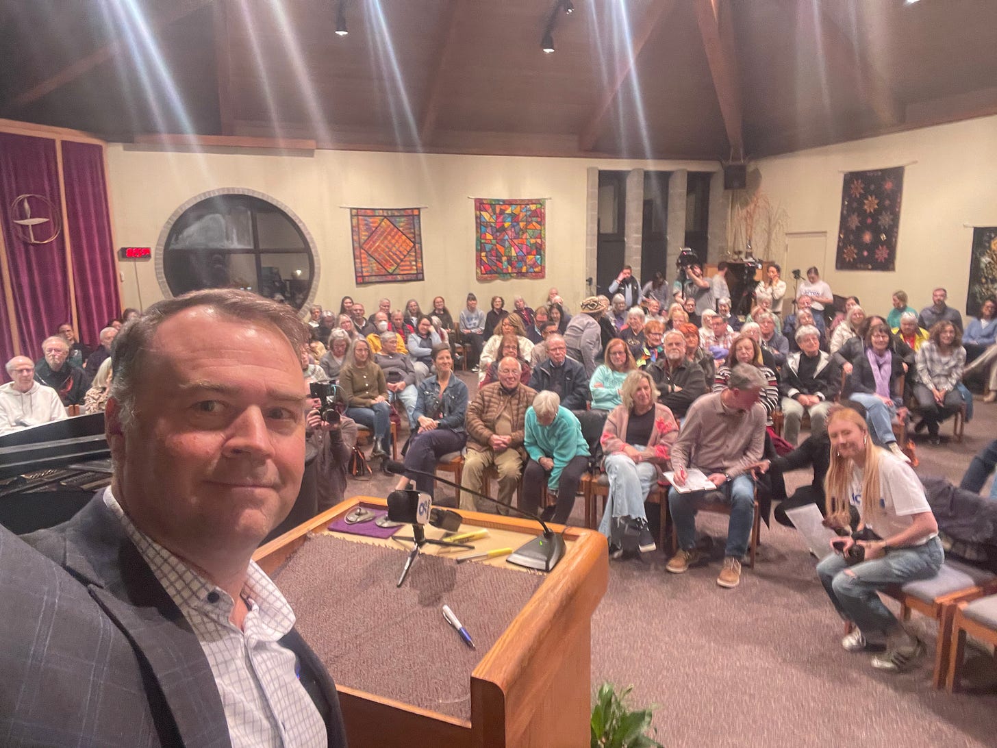 Every seat was full, as was every seat in an overflow room down the hallway.