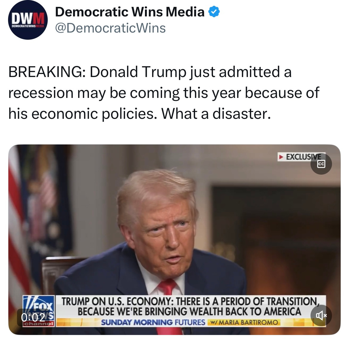And without using the word recession, a man famous for lying incessantly could not bring himself to say no. Instead, he said that we should expect a “period of transition” and that “these things take time.”