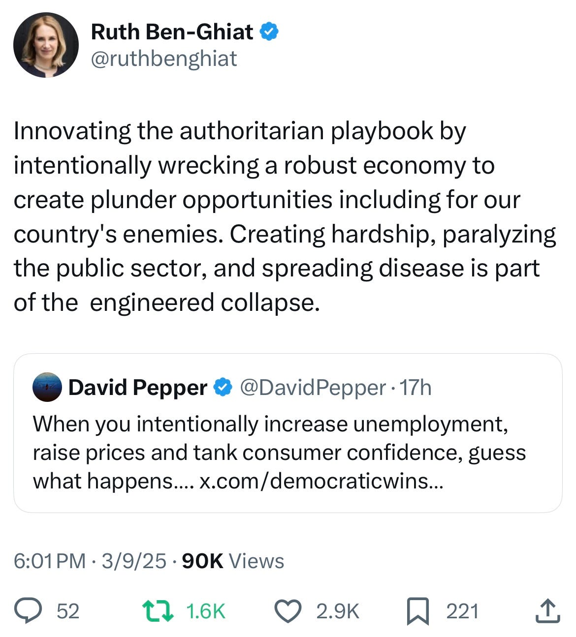 I was going to comment on exactly what Dr. Ruth Ben-Ghiat stated: this entire escapade is very deliberate. They know it would be political suicide to publicly attempt to privatize the entire government operation, so instead, they will crash the economy, where the oligarchs can buy up everything at pennies on the dollar. Take over the operation of what the government can "no longer afford", and plunder and pillage the funding of all our social services. We. Must. Fight. !!!