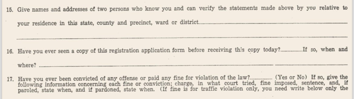 And they’re using an old Jim Crow tactic to accomplish their goal. As I explain in the video above, it’s a tactic not all that different from old voter registration forms designed to chill pro-democracy activity, like this one: